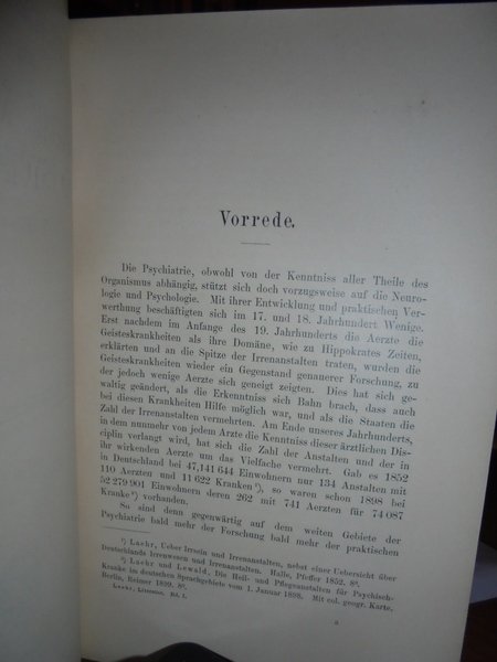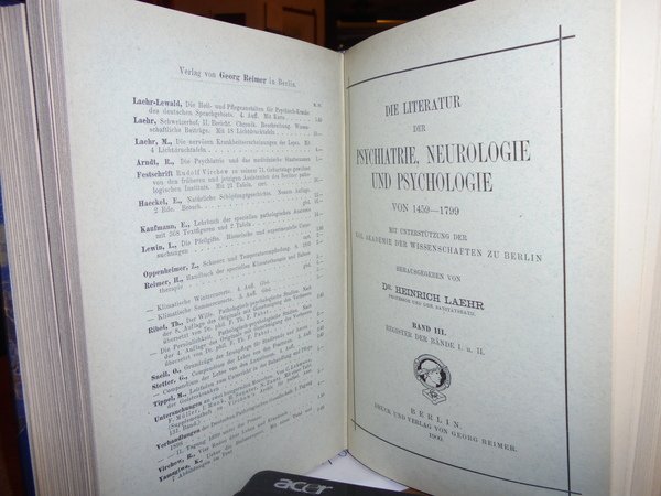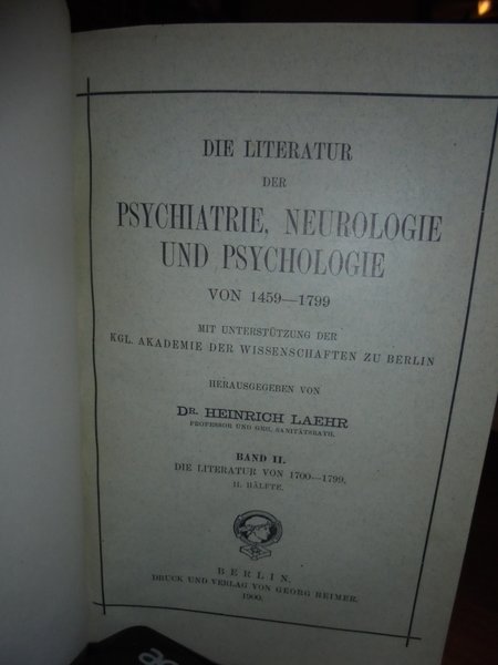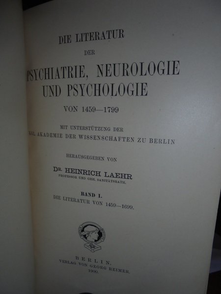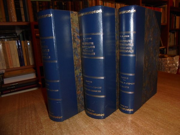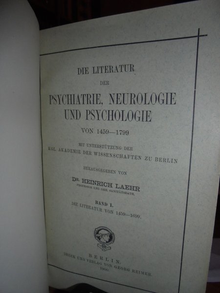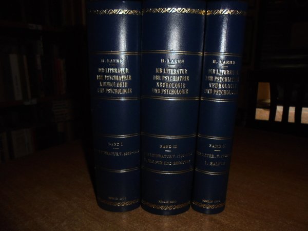 Heinrich, Laehr. Berlin, Druck und verlag von Georg Reimer, 1900. Die Literatur der Psychiatrie, Neurologie und Psychologie von 1459 - 1799. 3 volumi in-8°, m. pelle con larghe punte, titoli e fregi in oro ai dorsi, copertine originali conservate. viii, (1), complessive 1131 pp.; 271 pp.; 544 pp. Perfetto esemplare in prima edizione. Uff. D - II - 1