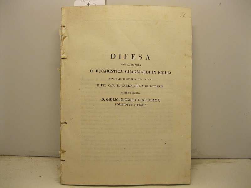 Difesa per la signora D. Eucaristica Guagliardi in Figlia qual tutrice de' suoi figli minori e pel cav. D. Carlo Figlia Guagliardi contro i signori D. Giulio, Niccolo' e Girolama Polizzotti e Figlia