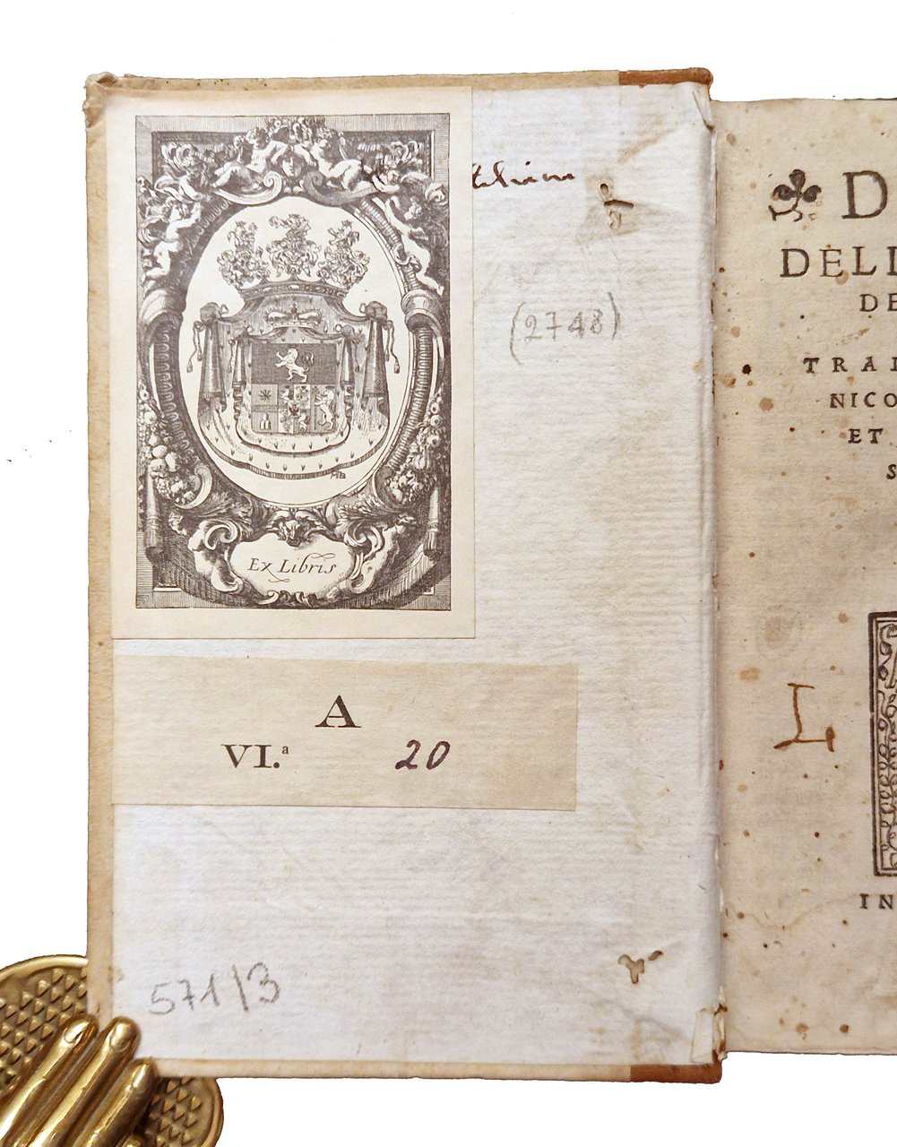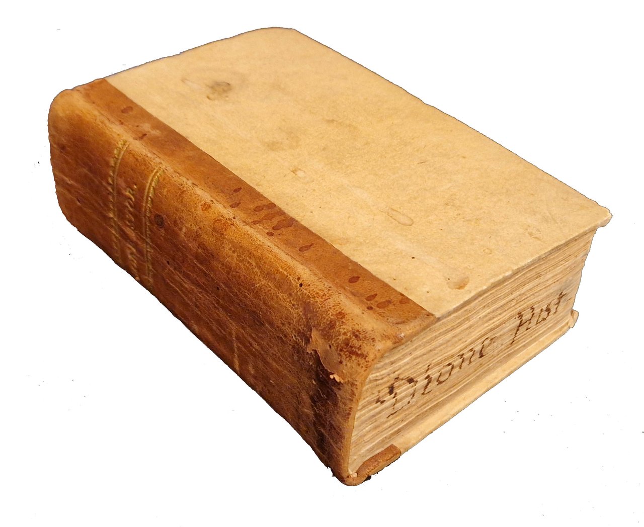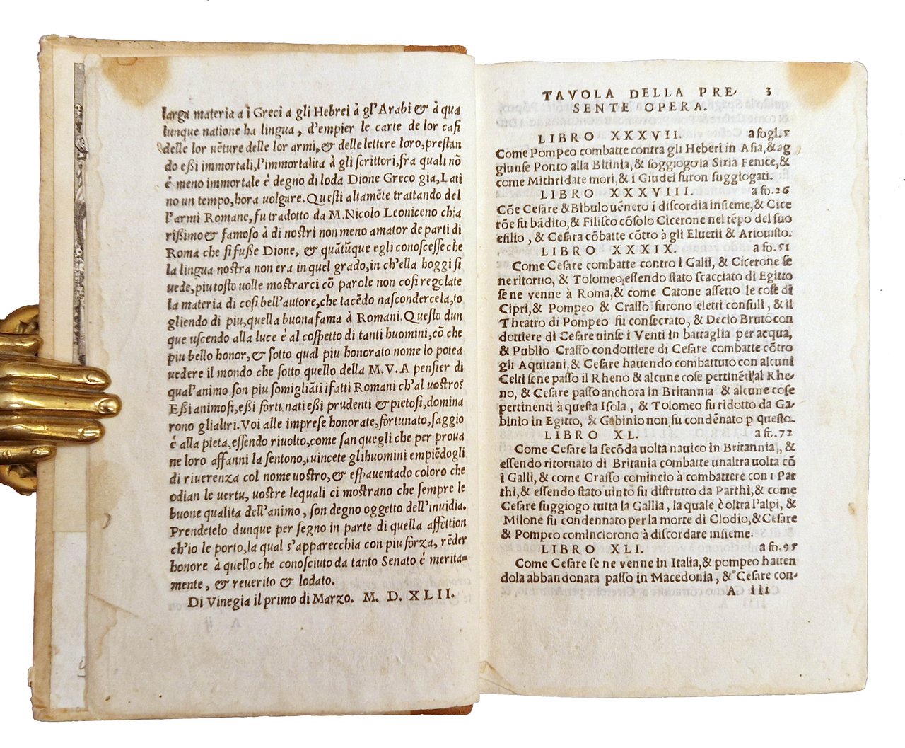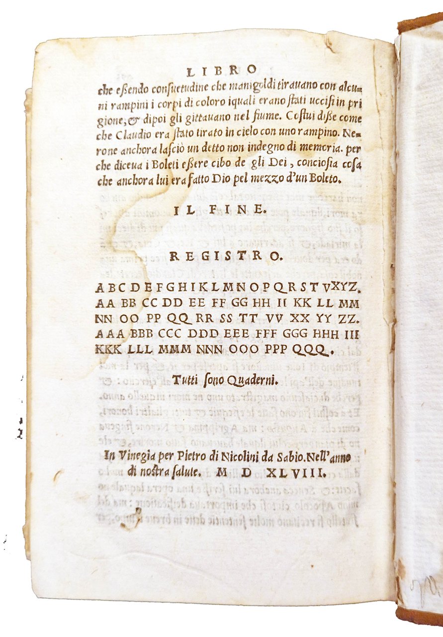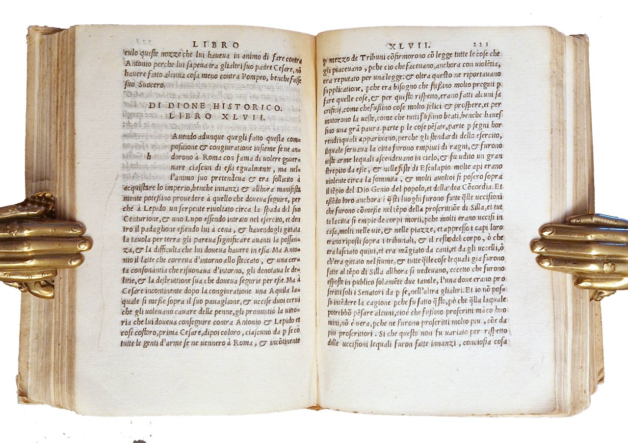 in-8°, 156x104 mm, leg. successiva in mezza pelle e cartonato, titolo in oro al dorso e manoscritto a inchiostro al taglio inferiore del libro; carte 493 (cioè 495 carte, errori nella numerazione delle carte 486-493). Note tipografiche nel colophon a carte QQQ8v. Iniziale a carta A5r e fregi in frontespizio xilografici. Marca xilografica al frontespizio: cavolo con serpente attorcigliato al gambo, in cornice. In basso la scritta: BRASICA. Bibliografia: Zappella, fig. 226. Terza edizione della traduzione italiana di Niccolò Leoniceno della storia di Roma di Cassio Dione (noto anche come Dio Cassio), un'importante fonte per la storia dell'impero romano. Il medico, editore, traduttore e collezionista di libri Niccolò Leoniceno fu il primo a tradurre Cassio Dione dal greco. Sebbene la traduzione fosse stata completata alla fine del XV secolo, la prima edizione non apparve fino al 1533, sette anni dopo la morte del traduttore. Dion Cassius (Dio Cassius; Cassius Dio; Dione Cassio)(circa 155-circa 235), senatore e storico greco, figlio di Cassio Aproniano, fu educato a Roma dove intraprese la carriera politica. Fu senatore, governatore della Dalmazia e della Pannonia superiore e console per due mandati. Nato a Nicea intorno al 155 e ivi morto intorno al 235 d.C. Leoniceno, Nicolò (1428-1524), umanista. Celebre professore di Medicina e Filosofia all'Università di Bologna, a Padova e a Ferrara. Nato a Vicenza, morto a Ferrara. Prov.: Importante ex-libris con stemma nobiliare, incollato al contropiatto anteriore. Antiche iniziali L. A. manoscritte al frontespizio a sin. e a destra della vignetta. Rif.: IT\ICCU\BVEE\014721. OCLC, 38666860. Cond.: Lievi tracce d'uso alla legatura, che presenta alcuni piccoli fori di tarlo. carte abbastanza pulite, presenza di piccole macchie e forellini al frontespizio (non interessanti il testo), macchie e bruniture occasionali ad altre carte e alone marginale alla parte superiore delle ultime cinquanta carte, circa. Esemplare nel complesso in buone condizioni. -- Third edition of Niccolo Leoniceno's Italian translation of Cassius Dio's (aka Dio Cassius) history of Rome, an important source for the history of the Roman empire. The physician, editor, translator, and book collector Niccolo Leoniceno was the first to translate Cassius Dio from the Greek. Though the translation was completed in the late 15th century, the first edition did not appear until 1533, seven years after the translator's death. Cassius Dio, a 3rd century Roman senator and historian born in Greece, produced a sweeping history of Rome in 80 books, from the mythical landing of Aeneas in Italy to the founding of Rome up to 229, Cassius Dio's own time. Only some of these have survived to the present in a more or less complete state. The remainder have been reconstructed from other sources. Leoniceno translated books 37-58, the most complete and the only to be preserved by direct manuscript tradition. This book is an interesting survey of Roman wars.