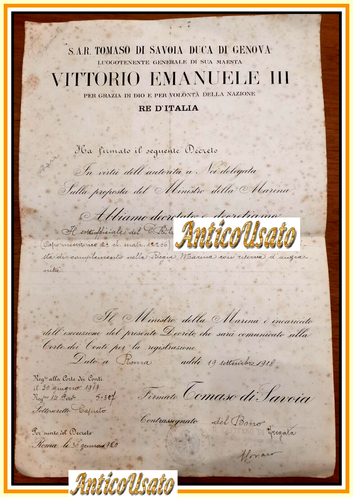 DIPLOMA DECRETO MILITARE MARINA ITALIANA promozione Tenente Macchinista 1918