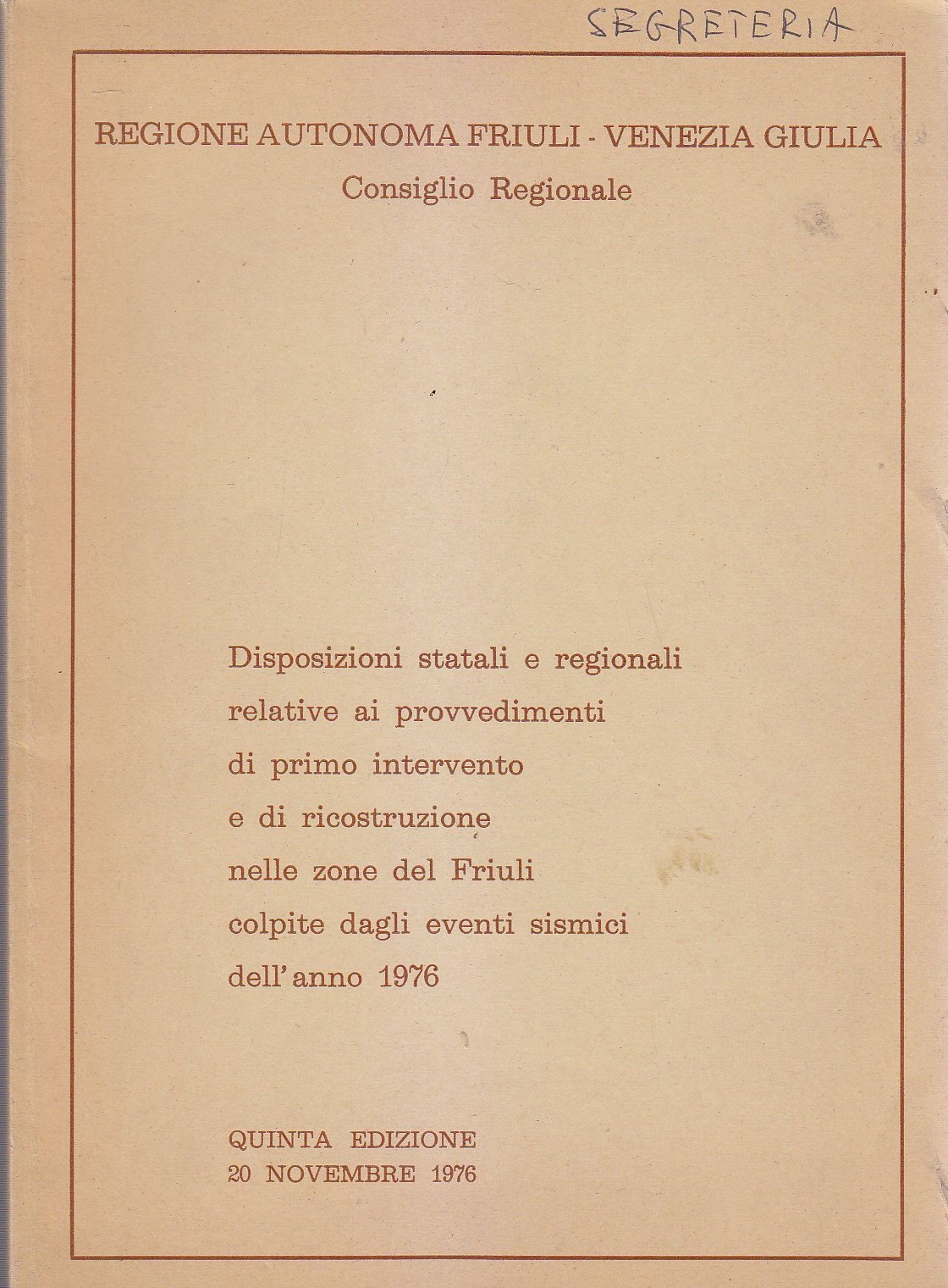 DISPOSIZIONI STATALI E REGIONALI RELATIVE AI PROVVEDIMENTI DI PRIMO INTERVENTO E RICOSTRUZIONE NELLE ZONE DEL FRIULI COLPITE DAGLI EVENTI SISMICI DELL ANNO 1976. Regione Autonoma del Friuli Venezia Giulia
