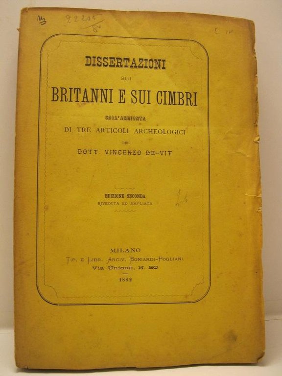 Dissertazioni sui Britanni e sui Cimbri coll'aggiunta di tre articoli archeologici del Dott. Vincenzo De Vit. Edizione seconda. Riveduta ed ampliata