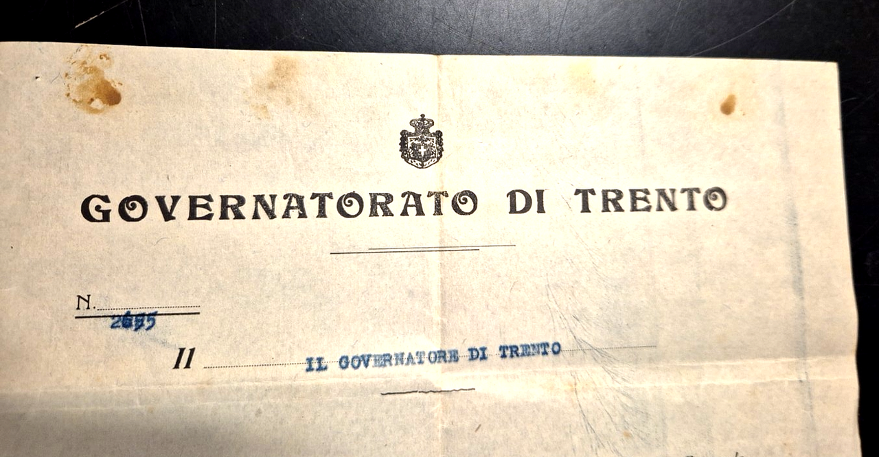 Interessante documento del 23 luglio 1919 del GOVERNATORATO DI TRENTO in cui