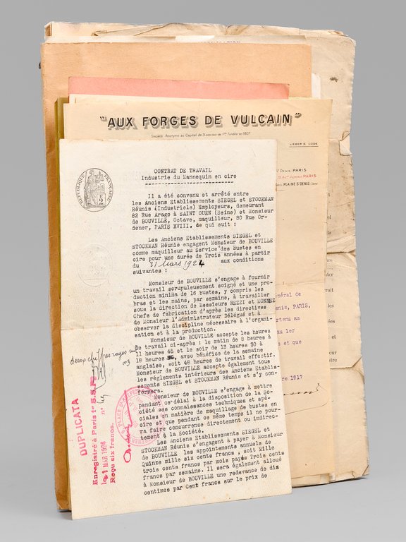 1 dossier contenant : [ Dossier d'archives sur Octave Louis Ernest Gossin de Bouville, dessinateur et décorateur ; Né à Neuvizy (Ardennes) le 21 mars 1899, marié à Henriette Vasseur : ] 2 cartes de prisonnier de guerre 1940-1941 ; Carte d'électeur 1938 ; Carte Ministère du travail Assurances sociales 1933 ; Curriculum Vitae signé de sa main (août 1937) ; Etat de service militaire ; "Pétition" concession cimetière (1952) ; Diplômes Ministère de la santé publique (don du sang) : 4 ; Extrait J.O. Médaille d'honneur du travail ; Photos : 5 ; Bulletins de paie : 15 (dont Imprimerie Curial-Archereau) + 5 (Mannequins Siegel, 19 rue Réaumur,Paris, 1935) ; Contrats de travail : 6 (Anciens établissements Grouvelle et Arquembourg, 1917 - Pierre Imans Mannequins d'Art 1924 - Aux Forges de Vulcain, 1917) dont un contrat de travail "comme maquilleur au Service des Bustes en cire" ; Lettres (courriers) : 8 (Jallais, Charente, nouvelles du Stalag) - 25 épreuves de bois gravés d'Octave de Bouville, 1 grand dessin original signé, 1 carnet de croquis (Ardennes : Eglise de Vaux-Montreuil, Moulin de Dendun, etc.) et 10 épreuves diverses ; Quittances d'assurance Mutuelle du Mans : 3 ; Reçus Assurances Sociales 1944-1945 : 17 + 2 ; Arrêté + attestation Ministère des régions libérées / Reconstitution foncière et cadastre : dessinateur (2 documents) ; Extrait d'acte de naissance ; . Intéressant dossier d'archives privées d'un dessinateur et décorateur ardennais, Octave de Bouville (Né à Neuvizy en 1899 - mort à Belâbre en 1974), passé par les écoles Germain Pilon et Bernard Palissy, et qui travailla notamment à l'emploi peu commun de "maquilleur au Service des Bustes en cire" pour la firme de mannequins Imans.
