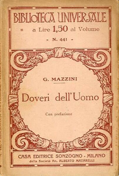 Rist. 96 p. ; 17 x 12 cm. Biblioteca universale Sonzogno, 441. I «Doveri dell’uomo» può essere considerato il testamento spirituale di Giuseppe Mazzini. Esso espone in una forma piana e accessibile il pensiero politico del padre della democrazia italiana che, per la sua capacità di individuare l’onda lunga della storia, è stato definito il «contemporaneo della posterità». Il saggio, frutto della piena maturità, iniziato nel 1841 e completato solo fra il 1859 e il 1860, è dedicato agli operai italiani. A loro Mazzini rivolge questo vero e proprio manuale di educazione civile, nel quale delinea una strategia riformatrice capace di liberarli da una condizione che non ammetteva alternative fra acquiescenza e scetticismo da un lato, e un sovversivismo privo di concrete prospettive politiche dall’altro. Brossura editoriale, coperta in carta illustrata con fregi, titolo impresso al piatto e al dorso. Segni del tempo alla carta (ingiallimento), qualche piccola sottolineatura a matita, per il resto libro integro. Codice libreria 6771.