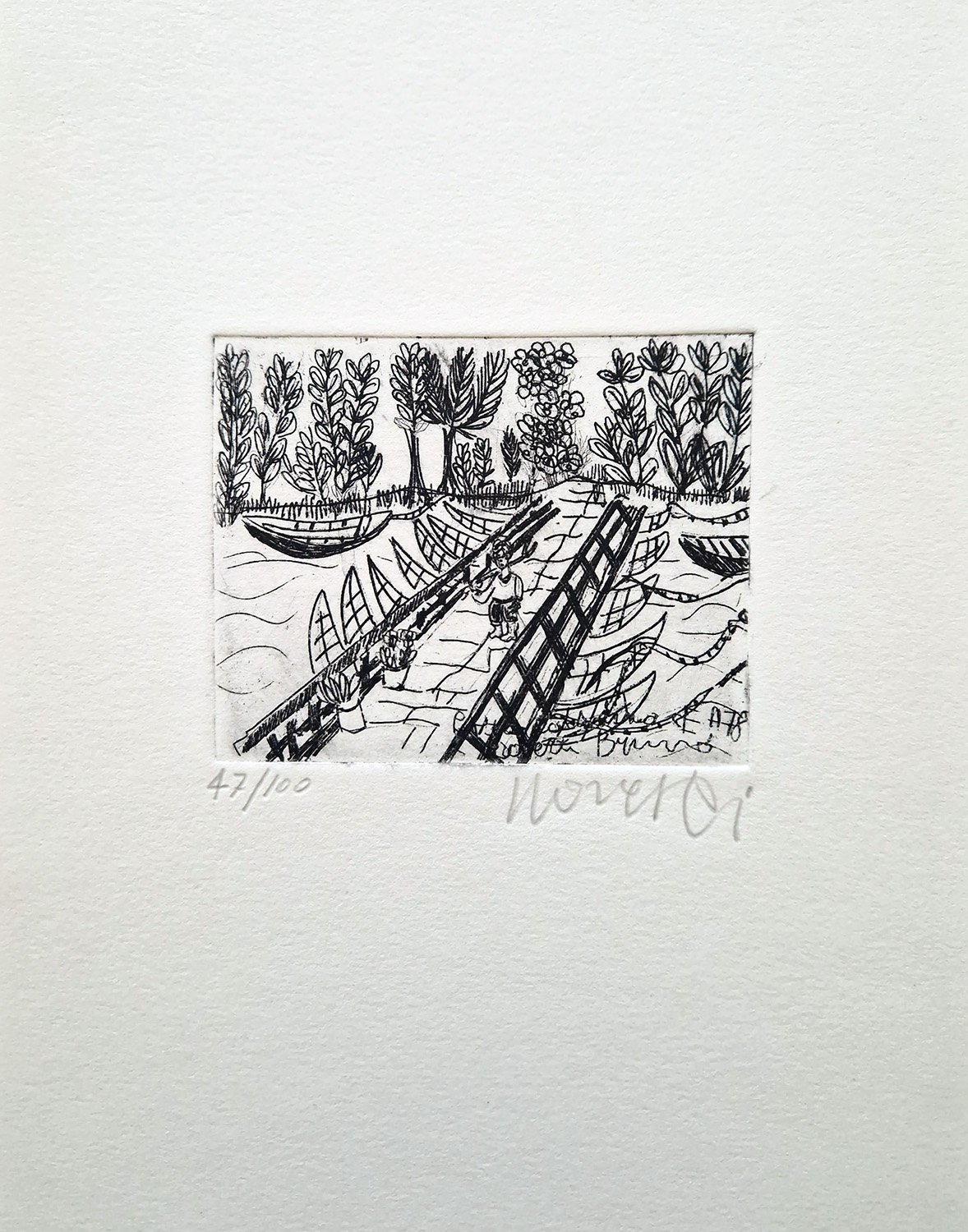 4°; pp. non num. 16 con 7 tav. f.testo su carta patinata, che riproducono altrettante acqueforti dell'Artista. Brochure edit. con titoli e piccola fotografia al piatto. Bella ediz. limitatata a soli 600 esempl. numerati, questo è uno dei 100 di testa, contenente sciolta una acquaf. originale num. e firmata a matita dal Rovesti (1907-1987).