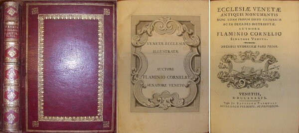 in-8 gr. (mm.235x172), pp. (10), 420, (4), bellissima leg. marocchino rosso-bruno con tit. e fregi oro al d. con nervi, riquadri e fregi in oro ai piatti, dentelles. Tagli spruzzati. Risguardi in carta marmorizz. Antip. inc. in rame e gr. vignetta in rame al front.E' il solo VII tomo della celebre e rara opera dello storico patrizio Corner (1693-1778), completa in 15 volumi ma quasi mai completa, ed è dedicato alla storia di 3 importanti chiese veneziane: SS. Giovanni e Paolo, San Domenico al Castello e Monastero del S. Rosario dei Domenicani. Sollecitato dai suoi contemporanei Apostolo Zeno e Angelo Calogerà, a questa edizione ne fece seguire nel 1758 una versione in lingua italiana, ma assolutamente incomparabile perchè ridotta in un unico volume. Cicogna, 3. Ottimo stato di conservazione, fresco esempl. [077]