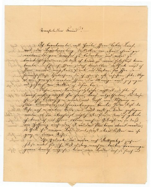 6 SS. auf 2 gefalt. und geheft. Doppelblättern. Gr.-4to. Mit eh. Adresse verso (Faltbrief). Schönes, langes Schreiben an seinen Schwager, den Kgl. Württembergischen Oberfinanzrat Gottlob von Rapp (1793-1869) hinsichtlich einer möglichen Rückkehr Melchiors und seines Bruders Sulpiz nach Stuttgart: "Verehrtester Freund! Ich beantworte erst heute Ihren lieben Brief, weil die Beantwortung desselben mir etwas schwer geworden, da gar manches zu bedenken und vieles zu berücksichtigen war, so daß ich kaum zu einem Entschluß kommen konnte. - Ehe ich Ihnen jedoch denselben mittheile muß ich Ihnen meinen innigsten Dank ausdrücken, für Ihre so freundschaftliche Theilnahme, die ich schon so oft erfahren habe. Möge es mir gewehrt werden Ihnen die Meinige einst zu zeigen und zugleich wie dankbar ich dafür bin. - Obschon mein Bruder jetzt sehr wohl ist, so habe ich dennoch nicht gewagt ihm ihren Brief mitzutheilen, da dieser ihn sehr beunruhigen würde und leicht eine Stöhrung in seiner Reconvaleszens hervorbringen könnte. Zudem steht die Sache noch in weitem Felde, und muß erst zu Faden geschlagen werden ob sie überhaupt möglich ist. Diesen Versuch glaube ich, kann ich mit Ihnen allein machen. Gelingt er, so daß mir Hoffnung vorhanden ist, aus dem Plan könne etwas werden; so theile ihn meinem Bruder mit, sonst aber laßen wir ihn ganz in seiner Ruhe. - Ihr Gedanke uns wieder nach Stuttgart zu ziehen hat so vieles für sich, daß ich troz manchen trüben Errinnrungen gerne darauf eingehe. Wäre mein Bruder noch so frisch und kräftig wie in alten Zeiten, so möchte die Sache sich leicht oder doch leichter machen wie jetzt. Mein Bruder könnte dann kräftig eingreifen und einen Posten als Direcktor der Kunstschule vollkommen ausfüllen. - Jetzt aber wo seine Gesundheit so schwankend ist, wo er nicht auf sich zählen kann, geht dieses nicht. Er könnte als Direcktor nur die Oberaufsicht führen, seine Gedanken aussprechen und der unter ihm stehende Inspecktor müßte sie ausführen und die Geschäfte besorgen so nemlich daß wenn mein Bruder leidend wäre, diese ohne alle Stöhrung ihren Weg fortgingen. - Ob sich dieses so gestalten und arangieren läßt steht dahin und ist sehr zu bezweifeln. Sollte jedoch die Regierung einen so großen Werth auf die Gewinnung meines Bruders zu dieser Stelle legen, daß sie auf solch eine freie Stellung einginge; so könnte und dürfte das Gehalt des Inspecktors nicht viel geringer als Jenes des Direcktors sein, da ihm die größere Arbeit zu fiele und ich die Ansichten meines Bruders in dieser Beziehung kenne. - Mit der Berufung meines Bruders zu diesem Posten aber wäre meine Versetzung verbunden, da wie Sie wissen er sich nicht von mir trennen mag. - Eine Versetzung von mir, aber ist mit mancherley Opfer verbunden [.] Sollte jedoch der König wünschen, daß meine Glasgemälde in dem neuen Kunstgebäude aufgestellt würden, ich mich also von ihnen trennen müßte, so könnte ich sie nicht anders als gegen Leibrente abgeben [.]". - Ab 1819 hatten die Brüder bereits in Stuttgart gelebt, wo ihre berühmte Altmeistersammlung öffentlich ausgestellt worden war. Rapp hatte vergeblich versucht, die Sammlung dauerhaft für Stuttgart zu gewinnen. König Ludwig von Bayern erwarb sie 1827 für die Münchner Alte Pinakothek. Sulpiz Boisserée heiratete 1828 Mathilde, eine Tochter des Stuttgarter Kaufmanns, Kunstfreunds und Schriftstellers Gottlob Heinrich von Rapp (1761-1832). 1835 wurde Sulpiz zum bayerischen Oberbaurat und Generalkonservator ernannt. Melchior Boisserée entwickelte eine einfache Methode, Glas zu färben, und verwendete diese zur Reproduktion von Werken aus seiner Sammlung. - Spuren alter Montage. Papierausschnitt durch Brieföffnung.