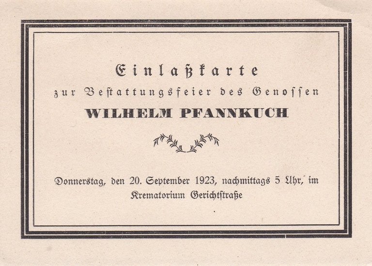 Einlaßkarte zur Bestattungsfeier des Genossen Wilhelm Pfannkuch.