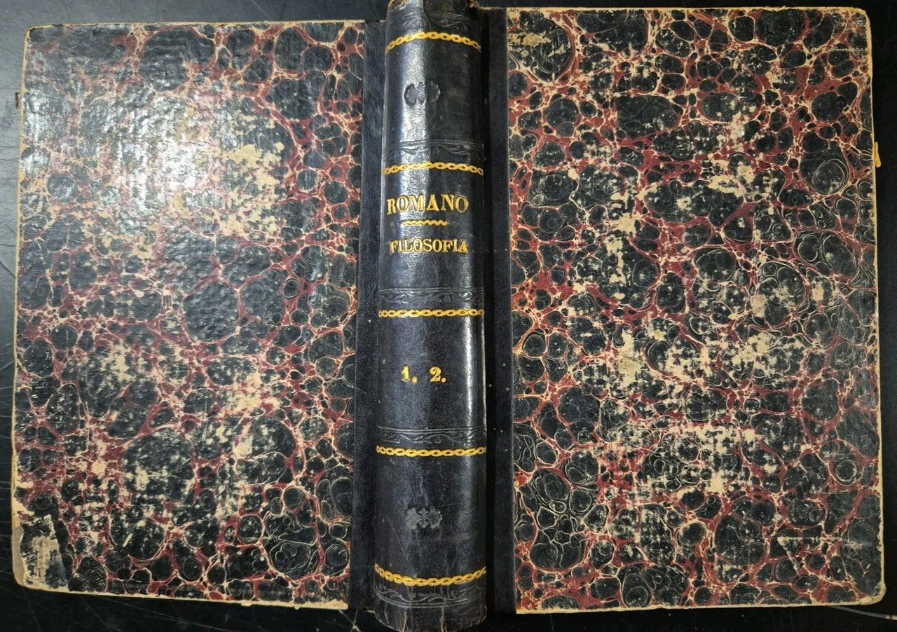ELEMENTI DI FILOSOFIA di Giuseppe Romano. 2 volumi, completa. Palermo, presso Bernardo Virzì editore proprietario, 1853.405 + 426 pagine. Elegante copertina coeva in mezza pelle con titoli dorati al dorso e piatti marmorizzati. Dimensioni: 13,5 x 19 cm. Stato di conservazione: molto buono (pagine normalmente