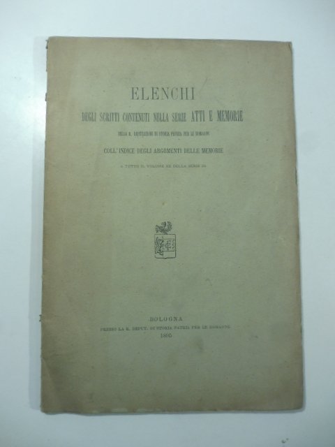 In 8 (cm 17 x 25), pp. 47 + (1b). Pagine intonse. Brossura editoriale. Comprende gli indici degli articoli pubblicati negli Atti e memorie della R. Deputazione di Storia patria per le Romagne fino al volume XII della serie III.