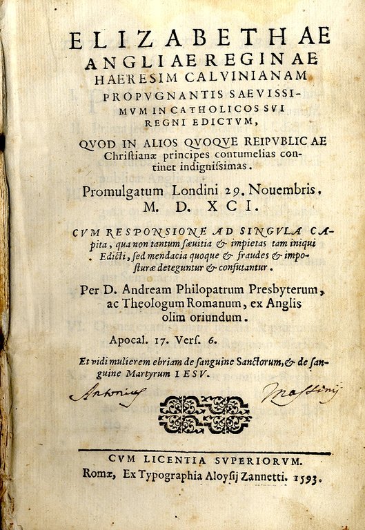 Elizabethae Angliae Reginae haeresim Calvinianam propugnantis saevissimum in catholicos sui regni edictum... Promulgatum Londini 29 novembris D.D.XCI. Cum responsione ad singula capita...per Andream Philopatrum.
