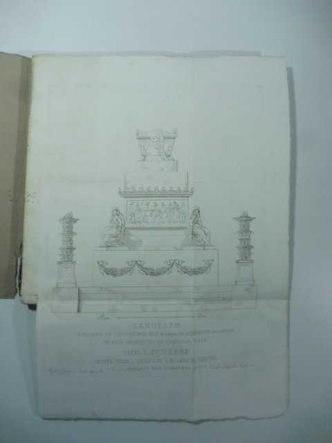 In 8 (cm 19,5 x 27), pp. (8) + 50 (ma 25 nella numerazione perche' doppie con testo inglese e traduzione italiana a fronte) + XII + (4). Una tavola all'antiporta ripiegata incisa all'acquaforte. Gora al margine inferiore delle pagine. Galleria di tarlo al margine interno bianco delle pagine. Elogio funebre bilingue del cardinale Thomas Weld, cardinale e vescovo cattolico inglese. La tavola raffigura il monumento funebre nella Chiesa di S. Maria in Aquiro.