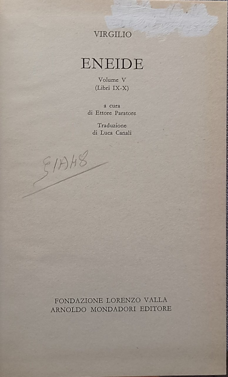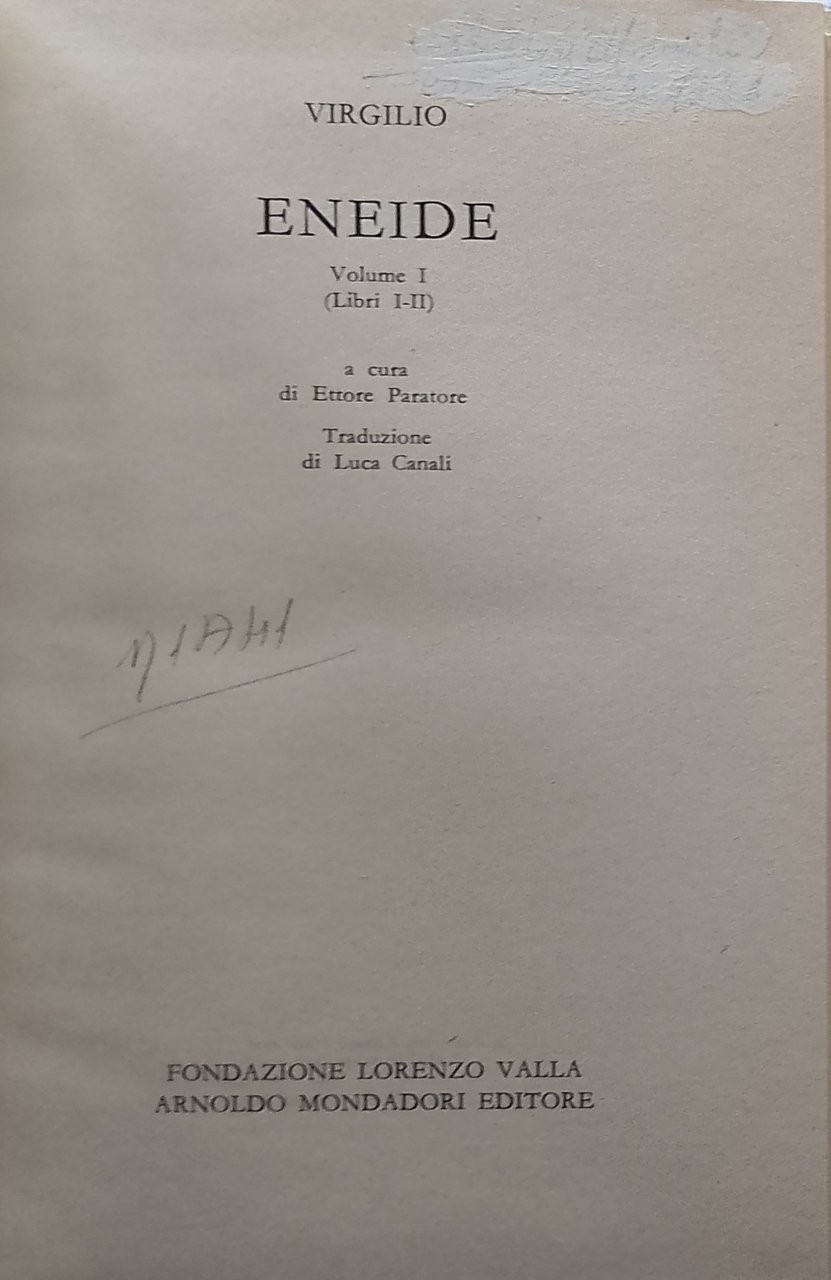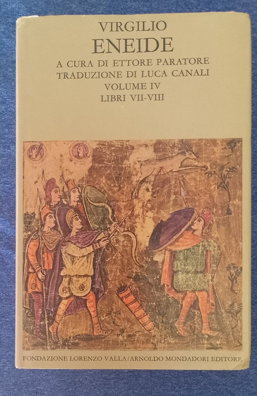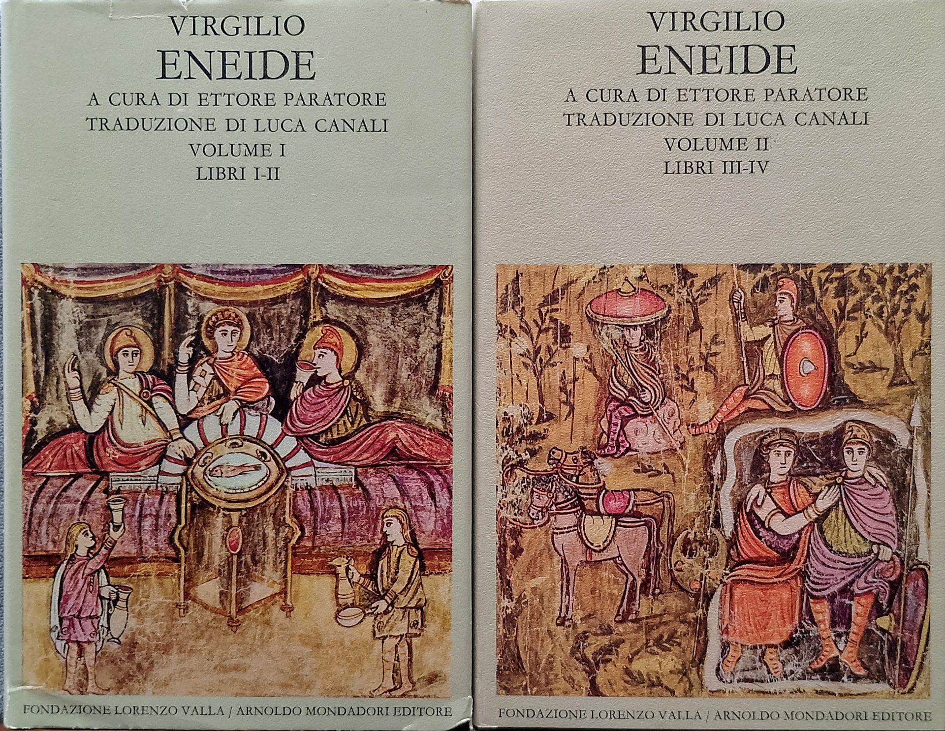 COD. 216 Copertina rigida con sovraccoperta, Pagg. LXIII-371+244+368+312+308+301 I vol. Libri I-II dell'Eneide, edito nel d1978: II vol. Libri III-IV 1978; III vol. Libri V-VI 1979; IV vol. Libri VII-VIII 1981; V vol. Libri IX-X 1982; VI vol. Libri XI-XII 1983. Condizioni molto buone. La sovraccoperta del primo volume ha dei piccolissimi strappi sul bordo del piatto anteriore e dei leggeri segni di usura al piatto posteriore, questi ultimi presenti anche al piatto posteriore del terzo volume. L'interno, con il testo latino a fronte, è in ottimo stato.