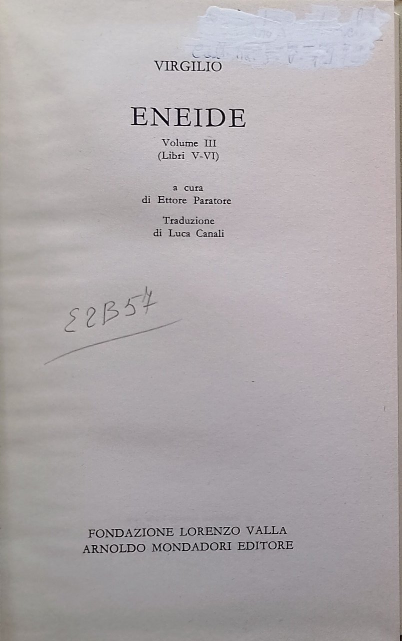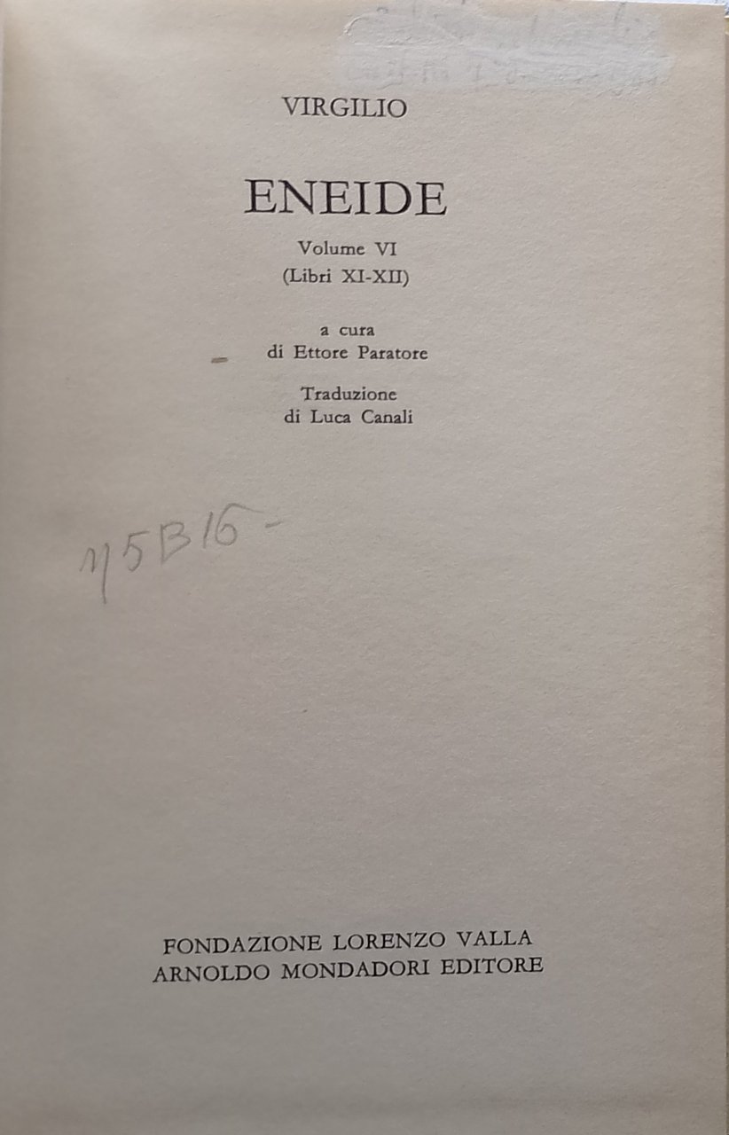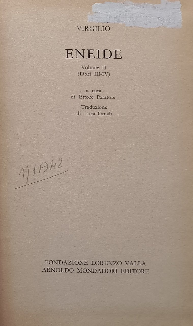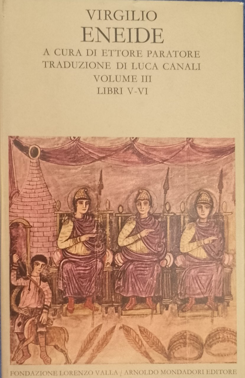 COD. 216 Copertina rigida con sovraccoperta, Pagg. LXIII-371+244+368+312+308+301 I vol. Libri I-II dell'Eneide, edito nel d1978: II vol. Libri III-IV 1978; III vol. Libri V-VI 1979; IV vol. Libri VII-VIII 1981; V vol. Libri IX-X 1982; VI vol. Libri XI-XII 1983. Condizioni molto buone. La sovraccoperta del primo volume ha dei piccolissimi strappi sul bordo del piatto anteriore e dei leggeri segni di usura al piatto posteriore, questi ultimi presenti anche al piatto posteriore del terzo volume. L'interno, con il testo latino a fronte, è in ottimo stato.