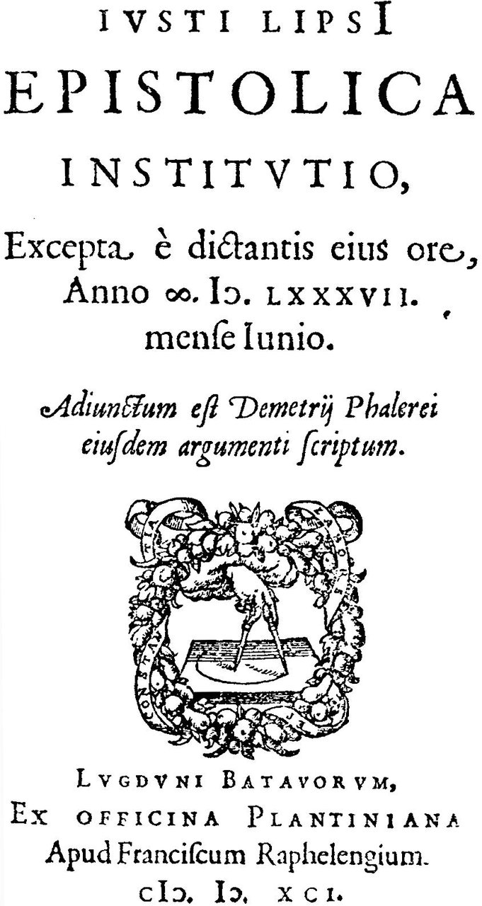 Epistolica institutio, Exepta è dictantis eius ore, Anno M.D. LXXXVII. Mense Iunio. Adiunctuum est Demetrij Phalerei eiusdem argumentum scriptum. [bound with:] Epistolarum centuriae duo. Leiden, Ex officina Plantiniana, Apud Franciscum Raphelengium, 1591.