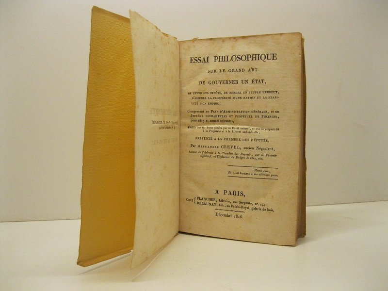Essai philosophique sur le grand art de gouverner un etat u', de lever les impots, de rendre un peuple hereux d'assurer la prosperite' d'une nation et la stabilite' d'une empire. Comprenant d'une plan d'administration ge'ne'ral et d'un syste'me fondamental et perpe'tuel de finances pour 1817 et anne'es suivantes. Etablis sur les bases pose'es par le droit naturel et sur le respect du' a' la propriete'.