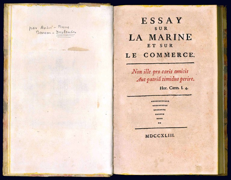 PRIMA EDIZIONE. L'opera apparve contemporaneamente anche ad Amsterdam presso François Changuion in 189 pagine. «Place tenue par la marine chez les peuples de l'antiquité et en France depuis le commencement de la monarchie. La Marine soutenue par l'autorité royale doit servir à protéger le commerce, à l'étendre, à lui donner chaque jour de nouveau accroissemens, et (....) le commerce doit servir à introduire l'abondance et toute sorte de richesses dans le royaume, à le rendre aussi puissant qu'il peut être. Critique de luxe, éloge des manufactures: l'une des plus graves conséquences de la révocation de l'Edit de Nantes fut le départ d'ouvriers, il faudrait imiter Edouard IV qui fit venir en Angleterre des ouvriers spécialisés» (INED, 737). Il saggio contiene anche interessanti riferimenti all'America.