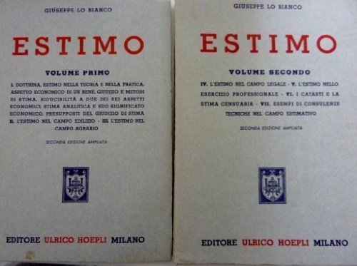 ESTIMO - Volume Primo : Dottrina, Estimo nella Teoria e nella Pratica,Aspetto Economico di un bene,giudizio e metodi di stima,riducibilità a due dei sei aspetti economici,stima analitica e suo significato economico,presupposti nel giudizio di stima, l' Estimo nel campo edilizio, l'Estimo nel campo agrario; Volume Secondo: l' Estimo nel campo legal,l'Estimo nell'esercizio proferssionale,i catasti e la stima censuaria,esempi di consdulenze tecniche nel campo estimativo. SECONDA EDIZIONE AMPLIATA