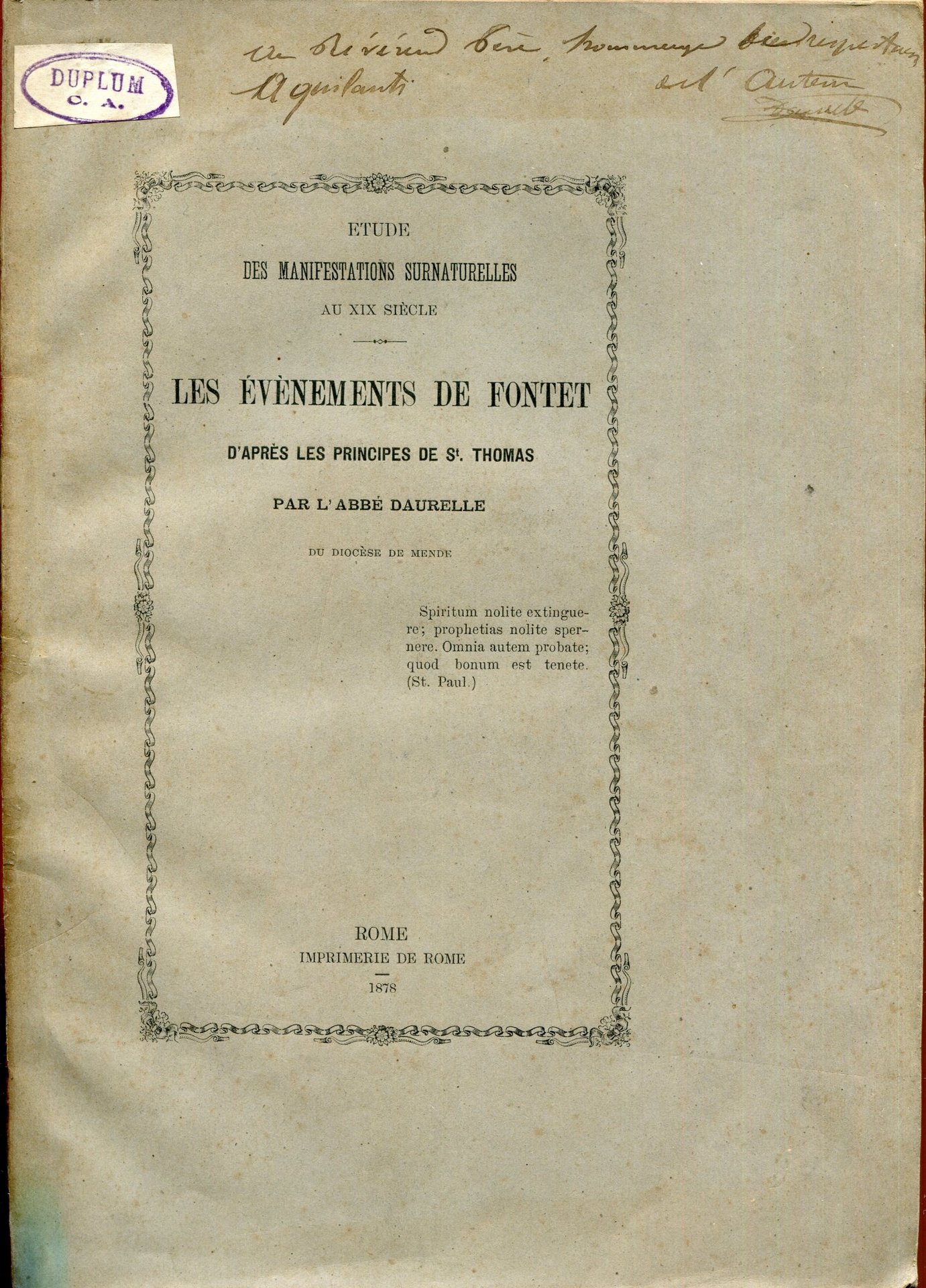 Etude des manifestations surnaturelles au 19e siècle. Les Evènements de fontet d'après les principes de Saint-Thomas
