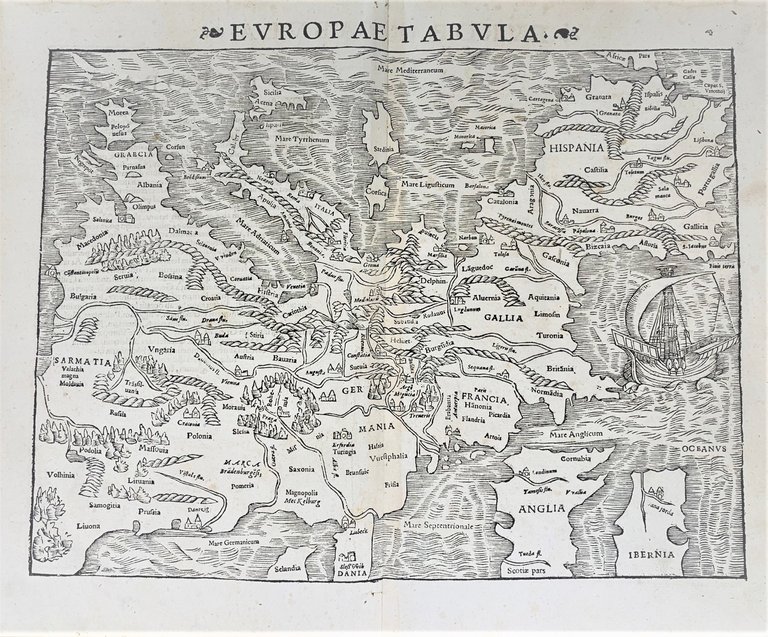 Double-page (325x395 mm) woodcut map of Europe from Sebastian Münster's famous "Cosmographia". One of the earliest representations of the European continent, unusually oriented with North at the bottom of the map. Text in Latin on verso with caption title. Sebastian Munster (1489 - 1552) was one of the three most renowned cartographers of the sixteenth century, along with Mercator and Ortelius. Munster's Geographia and Cosmographia Universalis were two of the most widely read and influential books of the time. The "Cosmographia Universalis" (1572) was a geographical as well as historical and ethnographic description of the world. First published in German in 1544 and in Latin the following year, the work quickly achieved enormous popularity, thanks to the rich illustrations and numerous geographical maps. Beautiful and scarce engraving, in good condition.