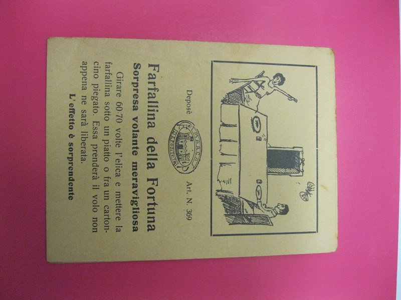 Piccolo pieghevole di 4 facciate (3 bianche) e stampa con testo e illustrazione solo a quella anteriore. Curiosa brochure che pubblicizza uno scherzo, la farfallina volante, che nascosta sotto un piatto o in mezzo ad un cartoncino spicchera' il volo non appena liberata.