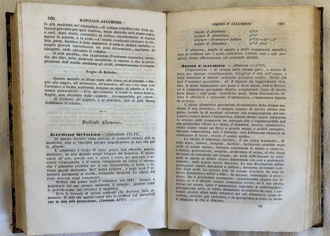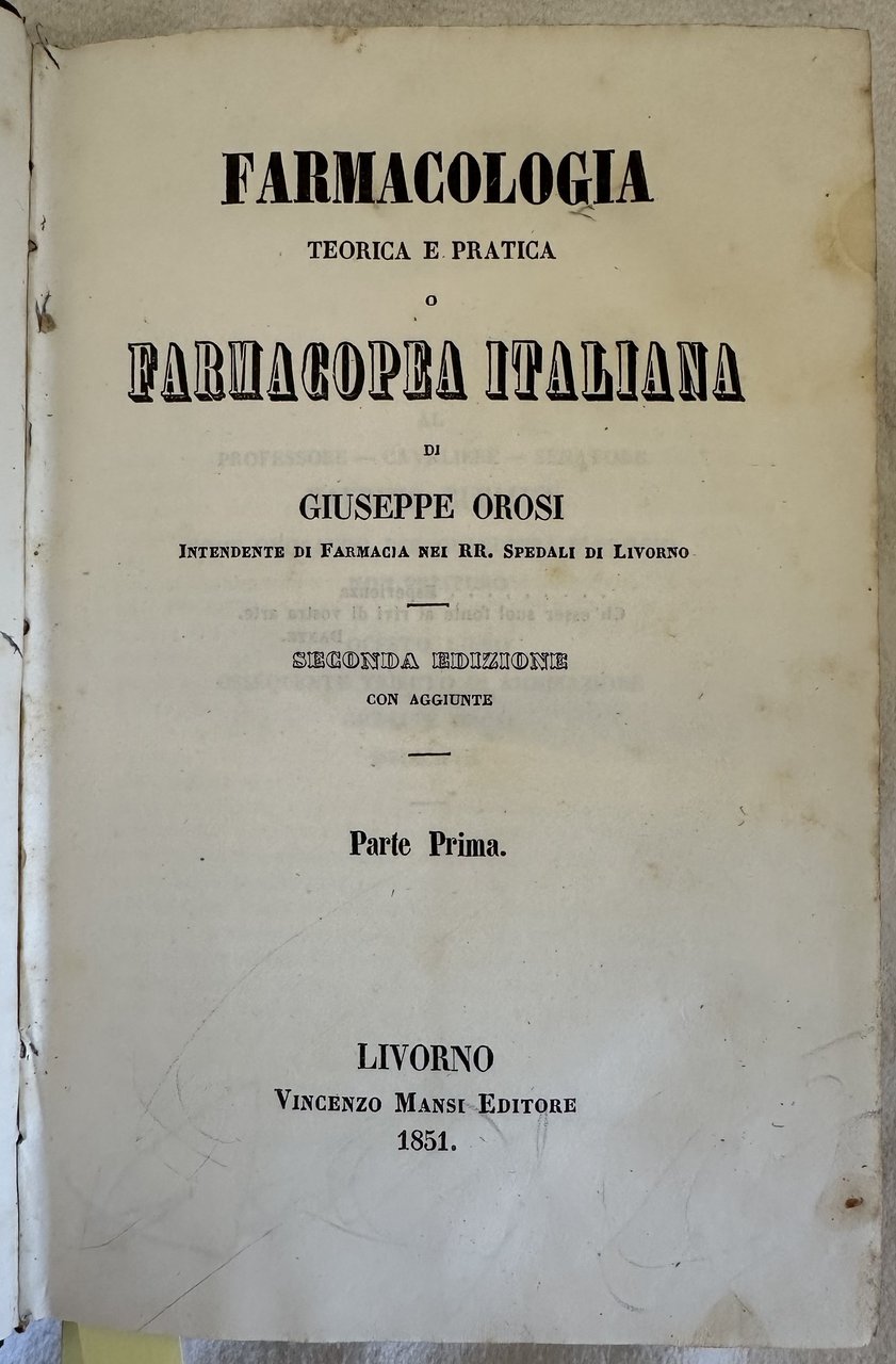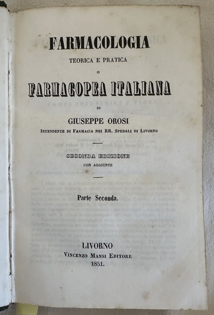 Edizione del 1851 di questa farmacopea del chimico Giuseppe Orosi (Pisa 1816- Livorno 1875). Laureatosi in farmacia si dedicò dapprima alle lettere e alla stesura di questa sua farmacopea. A paritre dal 1849 fu nominato professore all'Università di Firenze e in seguito a Pisa dove fondò la Scuola universitaria di farmacia. Fu qui che iniziò le prime ricerche chimiche sulle virtù terapeutiche dell'acqua termale. Nel 1855 eseguì le analisi nella sorgente di Livorno dove in seguito nacque lo Stabilimento termale Acque della Salute. Numerose ricette per preparazioni farmaceutiche. L'opera è in un volume divisa in due tomi ed è completa. In ottime condizioni. Copertina in mezza pelle coeva con titolo in oro al dorso in buone condizioni generali con lievi usure ai margini e dorso. Legatura in buone condizioni. Pagine in buone condizioni con fioriture. In 8. cm 19x13. Pp. XXXV+(1)+800, 801-1487+(1). Peso Kg. 1,2Edition of 1851 of this pharmacy book by the italian chemistry Giuseppe Orosi (Pisa 1816- Livorno 1875). Different recipes for pharmaceutical preparations. The work is in one volume and i is complete. Half leather coeval cover with gilted title in the spine in good conditions lightly worn in the extremities. Binding in good conditions. Pages in good conditions with foxing. In 8. cm 19x13. Pp. XXXV+(1)+800, 801-1487+(1). Peso Kg. 1,2