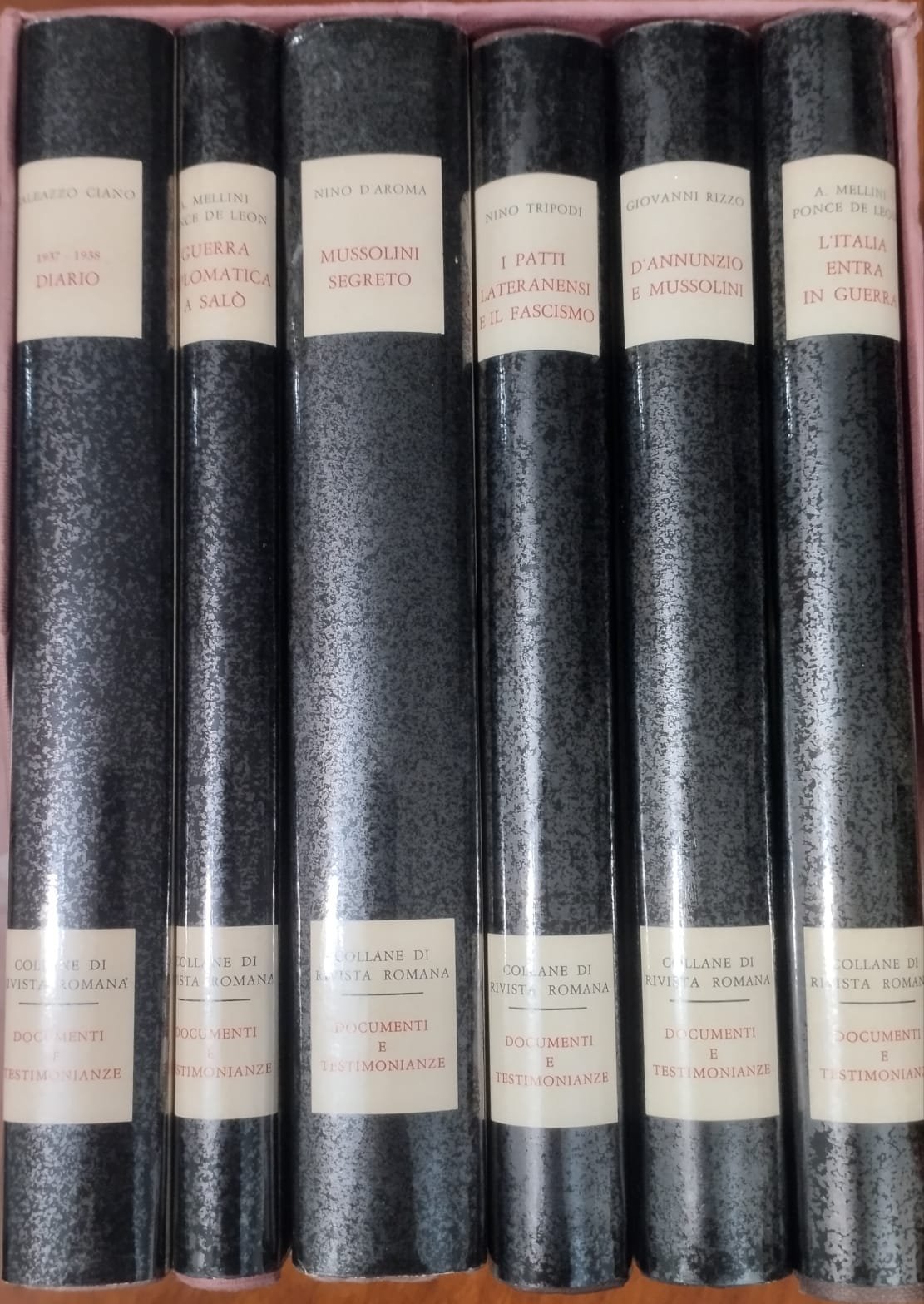 Raro cofanetto con 6 volumi rilegati con sovraccoperta editi dalle Arti Grafiche «F. Cappelli» per le “Collane di Rivista Romana – Documenti e testimonianze”: 1- Galezza Ciano, “Diario – 1937-1938”, 1948, p. 331; 2- Alberto Mellini Ponce de Leon, “Guerra diplomatica a Salò”, 1950, p. 213; 3- Nino D’Aroma, “Mussolini segreto”, 1958, p. 469; 4- Nino Tripodi, “I Patti Lateranensi e il Fascismo”, 1959, p. 310; 5- Giovanni Rizzo, “D’Annunzio e Mussolini”, 1960, p. 317; Alberto Mellini Ponce de Leon, “L’Italia entra in guerra”, 1963, p. 263. In ottime condizioni.