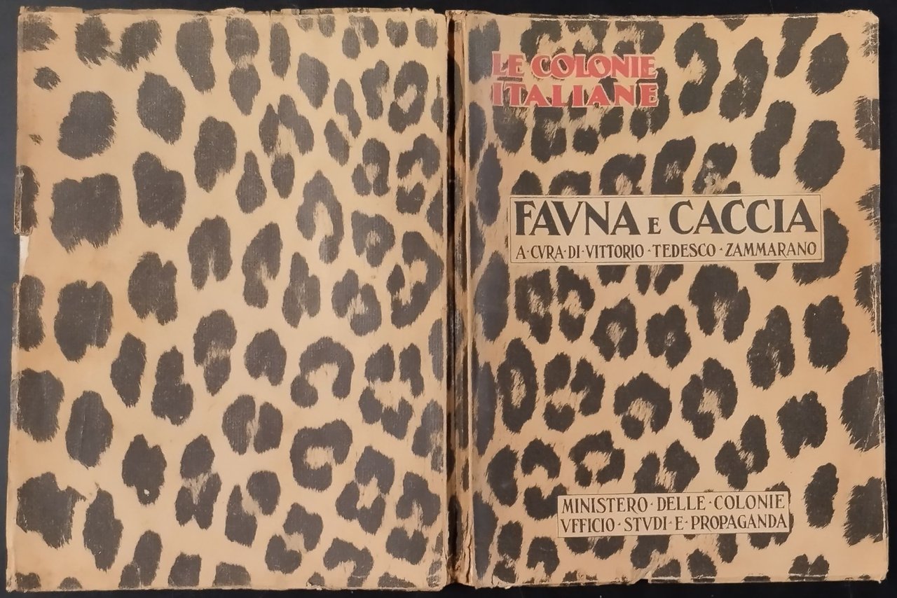 FAUNA E CACCIA Le Colonie Italiane di Vittorio Tedesco Zammarano. Ministero delle Colonie, Ufficio Studi e Propaganda, 1930. 222 pagine, numerose fotografie monocromatiche nel testo. Copertina editoriale in brossura. Stato di conservazione: buono (pagine normalmente ingiallite, copertina un po' sciupata) Libro usato saggistica