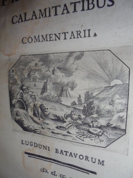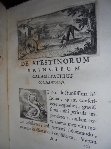 Venturino, Salvatore. Lugduni Batavorum, 1755. De Atestinorum principum calamitatibus commentarii. In - 8° (cm. 26 x 29), cartone coevo. 155 pp. al frontespizio bella vignetta inc. in rame che raffigura la città di Ferrara cinta da mura con, in primo piano, l'allegoria del fiume Po; A p. 3, elegante testatina raffigurante la favola del lupo e dell'agnello, nonché capolettera abitato, il tutto inciso all'acquaforte. Neg. mob. 7