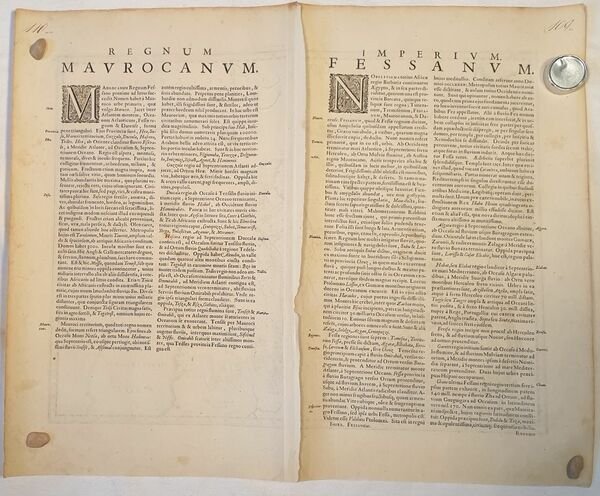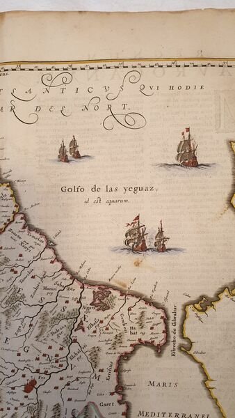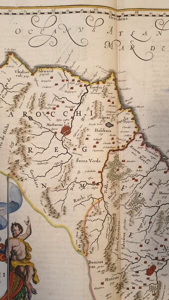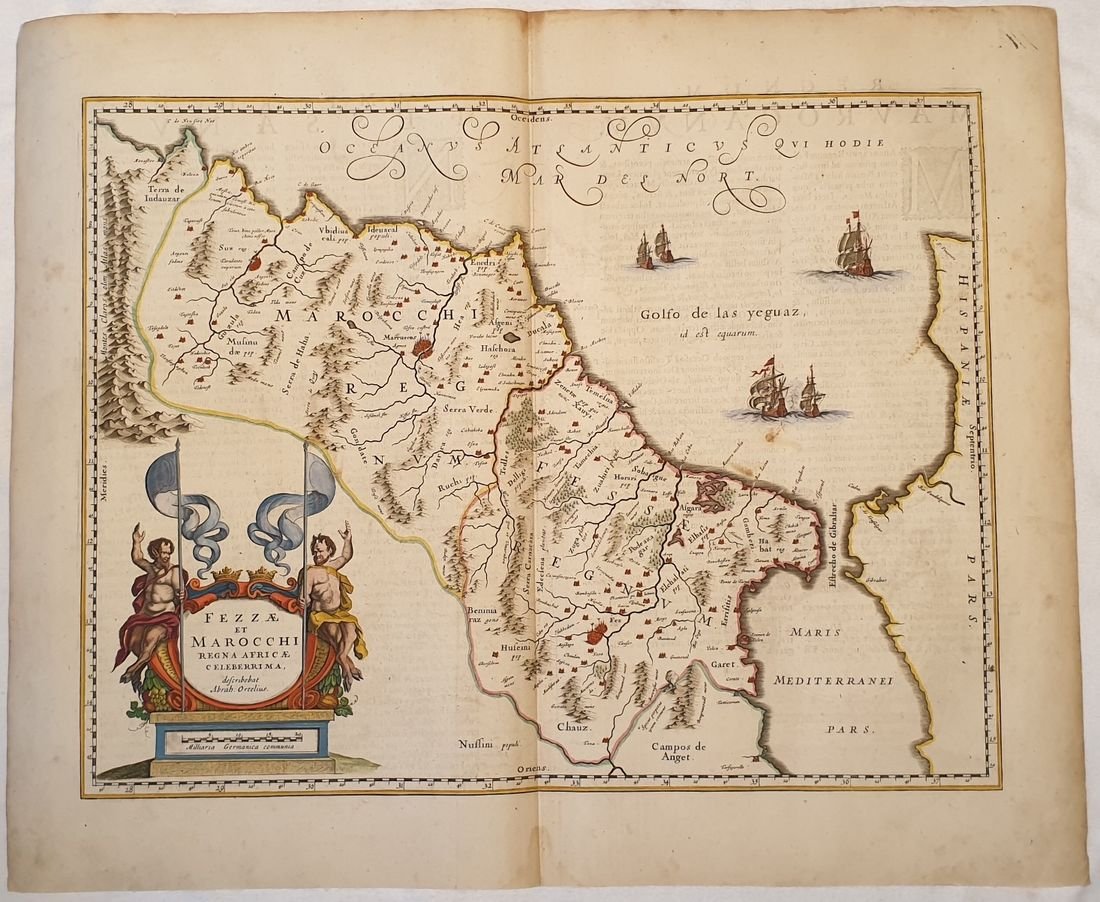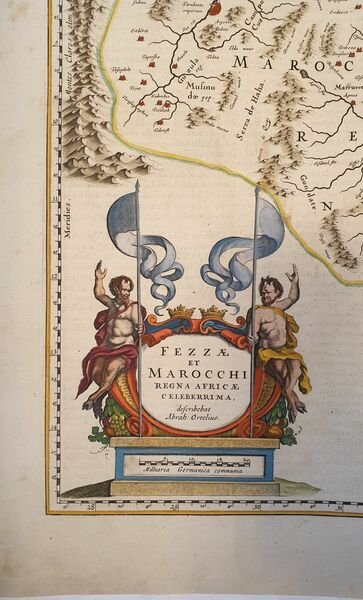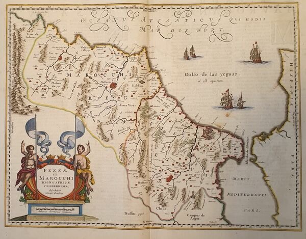TiTOLO: “Fezzae et Marocchi” tratto dal Nieuwen Atlas Amstelodami, Sumptibus Joannis Janssonii 1650 circa Dimensioni del foglio: 487 x 595 mm. Dimensioni dell'incisione: 390 x 505 mm. Tecnica: incisione su rame Condizioni generali: Eccellenti rare fioriture. Meravigliosa mappa del Marocco di grandi dimensioni acquarellata a mano tratta dall'Atlante "Nieuwen Atlas" [translation: The New Atlas], di Jan Jansson, pubblicata ad Amsterdam nel 1650 circa. La mappa mostra anche lo Stretto di Gibilterra. Titolo decorato con elaborato cartiglio. Descrizione completa del Marocco in lingua latina al verso. Jan Jansson, celebre cartografo, appartenente ad una lunga stirpe di stampatori attivi a partire dal XVII secolo. Si stabilirono prima ad Arnhem poi ad Amsterdam. Furono stampatori di mappe, di libri e librai. Title: “Fezzae et Marocchi” from Nieuwen Atlas Amstelodami, Sumptibus Joannis Janssonii 1650 circa Sheet size: 19.17 x 23.42 in; 487 x 595 mm. Plate area: 15.35 x 19.88 in; 390 x 505 mm. Technique: Copper engraving Overall condition: Excellent condition, with light foxing. A wonderful large scale hand-colored map of Morocco, from one of the great early 17th-century Atlas "Nieuwen Atlas" [translation: The New Atlas], by Jan Jansson, published in Amsterdam in 1650 circa <BR>The map shows also the Strait of Gibraltar. Elaborately decorated title and decoration cartouches. Complete description of Morocco in latin language in the verso. Jan Jansson was part of an influential family of map publishers from the Netherland throughout the 17th century and beyond. They were based in Arnhem than in Amsterdam. They were printers, publishers and booksellers. Overall Condition: Excellent