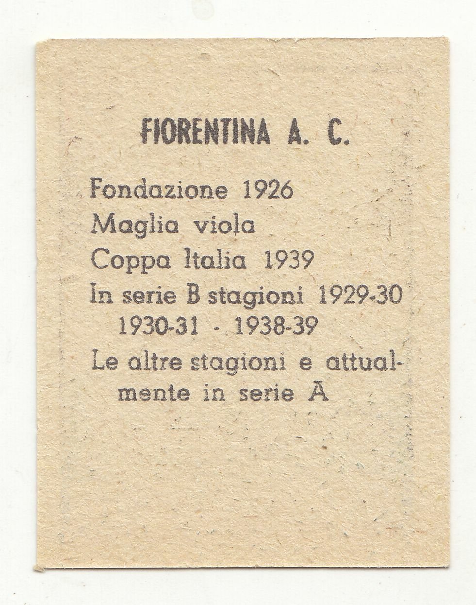 figurina originale della Fiorentina del 1949. La ditta produttrice dovrebbe essere la Mundus o la NanninaDimensioni: 4,5 x 3,5 cm. Stato di conservazione: ottimo