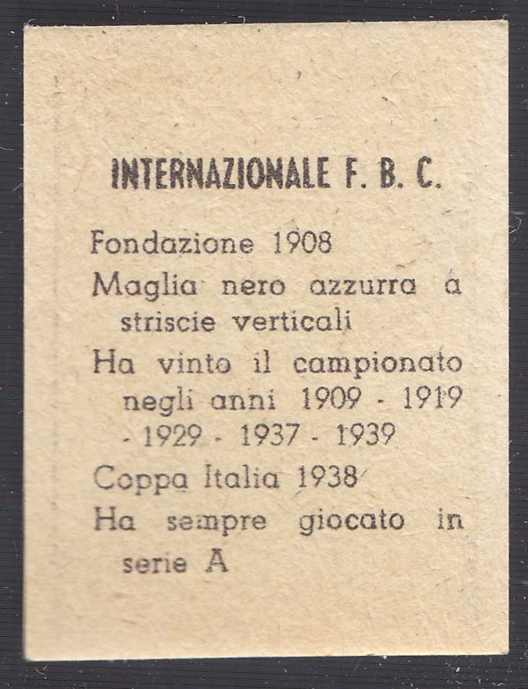 Bella figurina originale dell'Inter del 1949. La ditta produttrice dovrebbe essere la Nannina, ma non è sicuro. Dimensioni: 4,5 x 3,5 cm. Stato di conservazione: ottimo