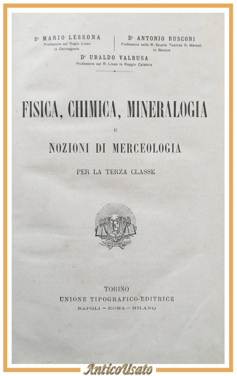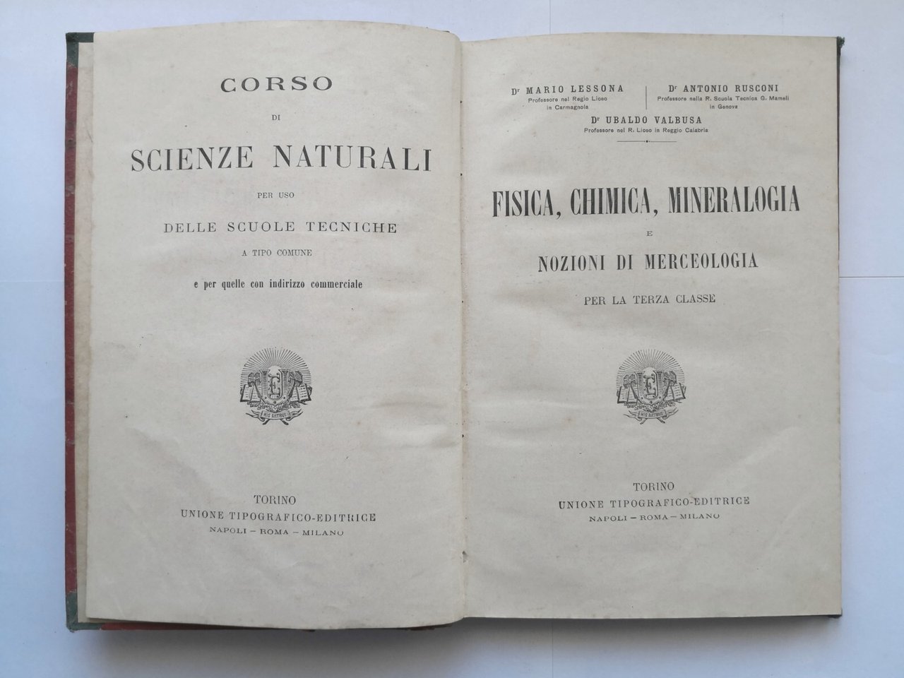 FISICA CHIMICA MINERALOGIA E NOZIONI DI MERCEOLOGIA di Mario Lessona, Antonio Rusconi, Ubaldo Valbusa. Corso di Scienze Naturali per uso delle scuole Tecniche.
