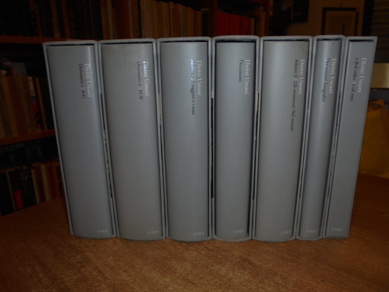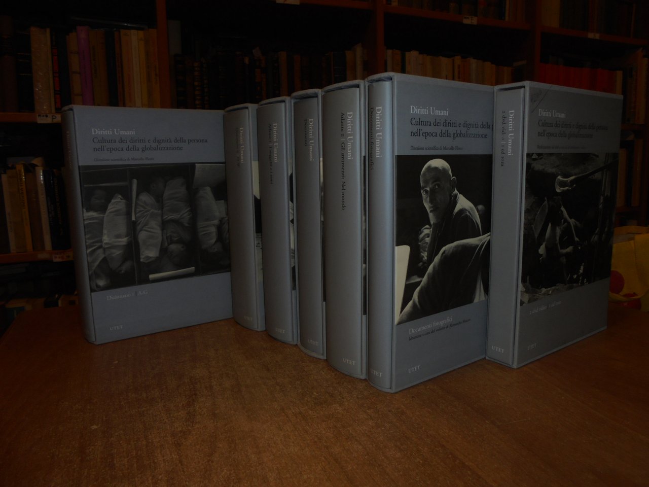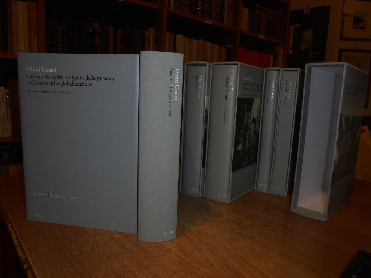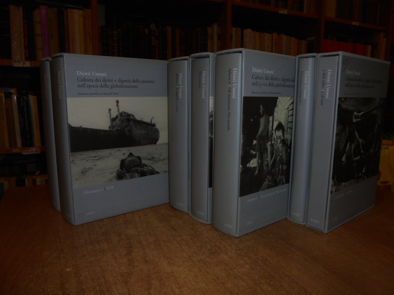 FLORES Marcello (Direzione scientifica a cura di). Diritti umani. Cultura dei diritti e degnità della persona nell'epoca della globalizzazione. Torino, UTET, 2007. 7 volumi in-8° grande, tela edit. con titoli e sovracopertine. Piano dell' opera: Dizionario 1/A-G. Dizionario 2/H-W (due volumi). per complessive 1443 pp. Atlante 1. I Soggetti e i temi. Atlante 2. Gli strumenti; Nel mondo. (due volumi). per complessive 1245 pp. Documenti/Documenti fotografici (due volumi). 519, 313 pp. + 2 dvd/1 cd rom. 6 volumi sono corredati da centinaia di illustrazioni anche a colori n.t. Esemplare (completo) in stato di nuovo negli astucci in cartonati rigido. Uff. stanzetta a sinistra in alto.