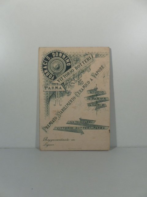 Pieghevole di 6 facciate (ciascuna misura cm 9,5 x 13,5 circa) con illustrazioni all'interno dei vari tipi di mattoni prodotti da questa fornace di Parma e un elenco dei vari tipi di materiale senza l'indicazione del prezzo. Non datato ma risalente al 1900 circa.