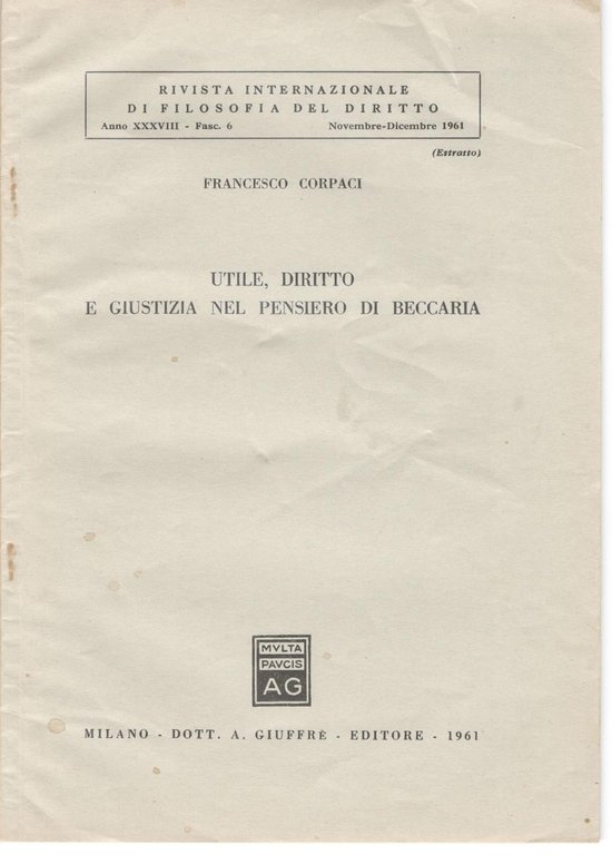 Francesco Corpaci Utile diritto e giustizia nel pensiero di Beccaria estratto GiuffrË 1961