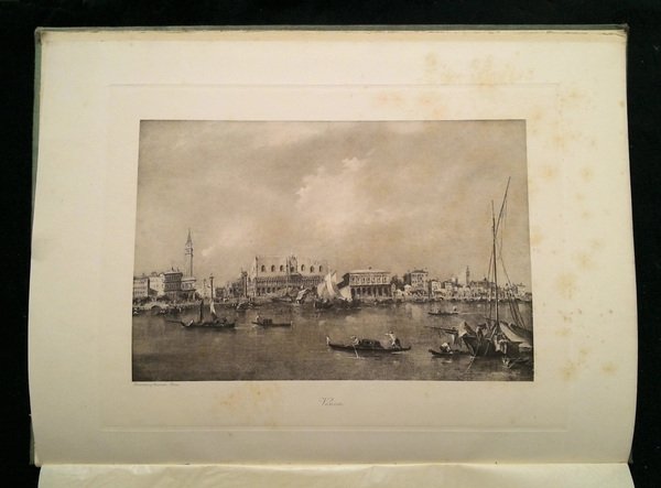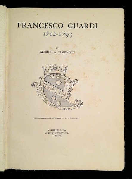 4to grande (375x278 mm); pp. 103; bellissima incisione al frontespizio di grande dimensione con stemma araldico coronato, 42 illustrazioni in b/n f.t. protette da velina, di cui 5 in fotoincisione (una all'antiporta), la maggior parte delle quali raffiguranti Venezia e le sue opere d'arte; leg. in tela editoriale color grigio-verde (scolorito negli angoli inf. dei piatti), titolo al piatto e al dorso, a caratteri incisi e dorati, prezioso decoro dorato al dorso liscio, taglio sup. dorato e altri tagli non rifiniti. Prima edizione. Rif.: IT\ICCU\TO0\1244715. Cond.: Presenza di alcuni arrossamenti e macchie alle carte, piccolo strappo al bordo superiore della prima guardia libera (senza mancanze e riparabile). A parte i piccoli difetti indicati, opera in buono stato di conservazione generale. -- FIRST EDITION OF THIS COLLECTION OF MASTERPIECES BY FRANCESCO GUARDI. Some redness and stains at leaves, a little tear at the upper edge of the first free-leaf (without loss, repairable). Otherwise, copy in good condition.