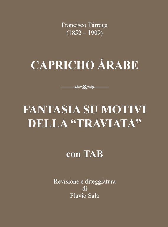 Due capolavori del repertorio chitarristico, «Capricho árabe» e la «Fantasia su motivi della Traviata» del compositore-chitarrista spagnolo Francisco Tárrega. Revisione e diteggiatura a cura di Flavio Sala. Contiene i QR Code Link alle Master Class in Diretta Streaming, in cui Flavio Sala spiega il lavoro di revisione e di diteggiatura.