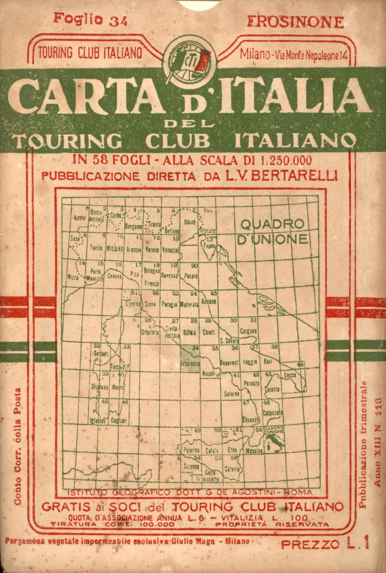 Foglio 34 - Frosinone. Con custodia originale in pergamena vegetale. Allegato fascicolo con indice delle località contenute nella carta e legenda dei segni convenzionali. Stampa a colori. Scala 1:250.000. 914.5 - Ba Ottimo (Fine)