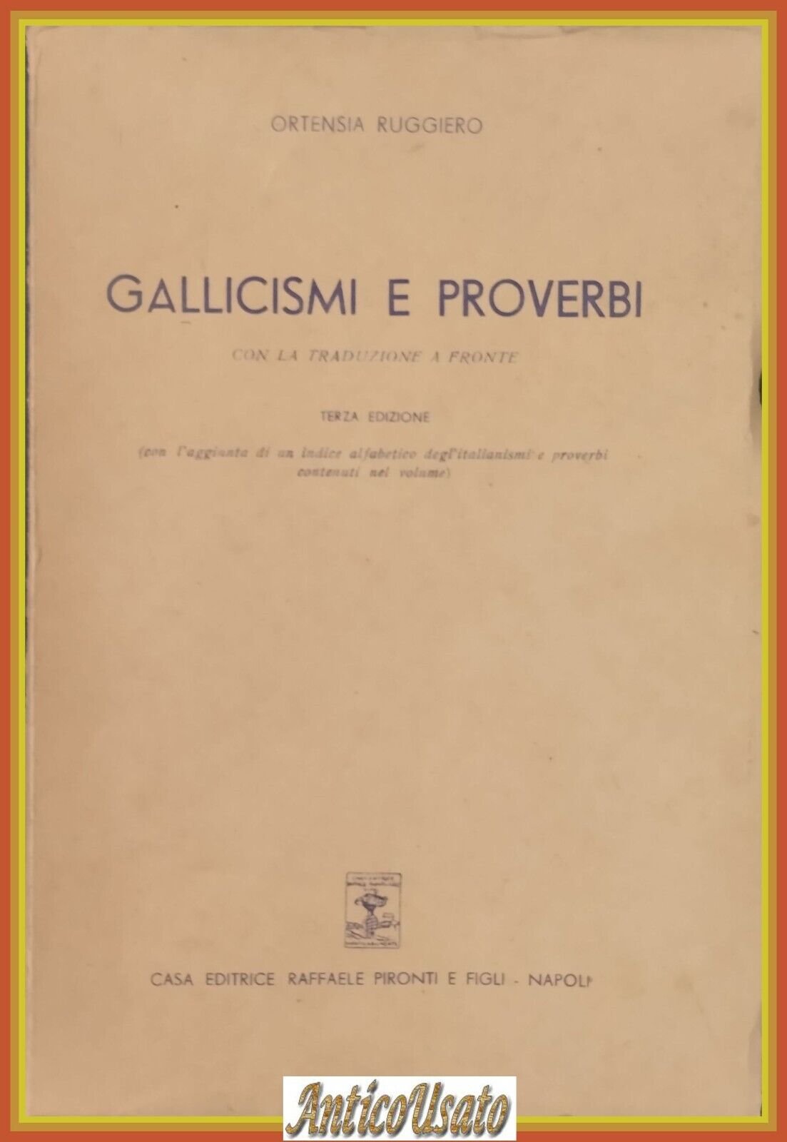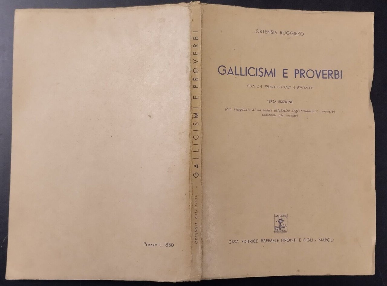 GALLICISMI E PROVERBI CON LA TRADUZIONE A FRONTE di Ortensia Ruggiero, con l'aggiunta di un indice alfabetico degl'italianismi e proverbi contenuti nel volume.