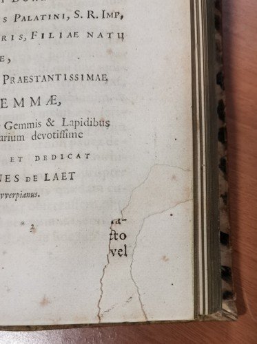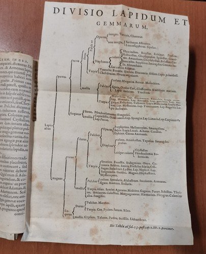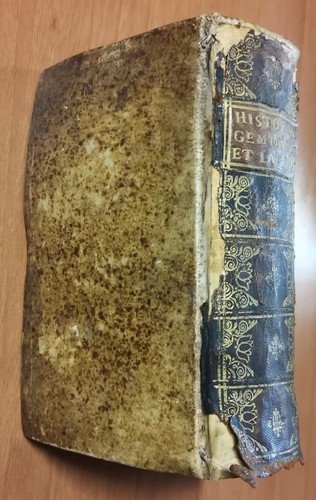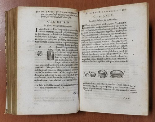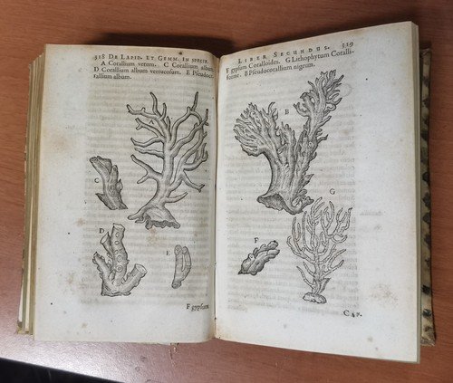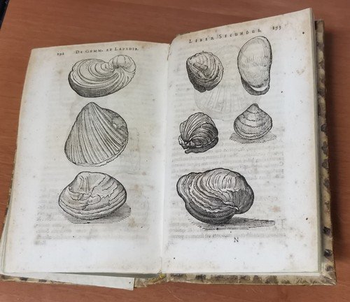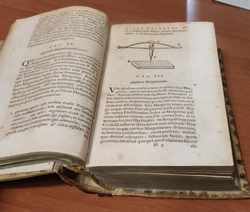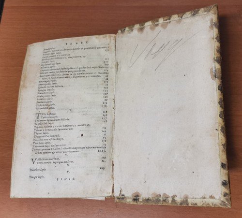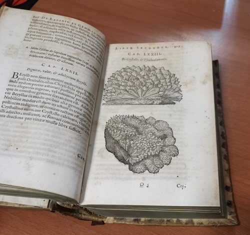 VIII, 576, (22) pagine, numerose incisioni nel testo e due tavole più volte ripiegate. A fine volume: Ioannis De Laet Antuverpiani: de Gemmis et lapidibus libri duo quibus praemittitur Theophrasti liber de lapidibus graece et latine cum brevibus annotationibus. (LXIV), 210, (6) pagine, numerose incisioni nel testo. Copertina antica in tutta pelle con titoli e fregi dorati entro tasselli al dorso. Dimensioni: 19 x 12,5 x 6 cm. stato di conservazione: buono (fioriture, pagine ingiallite, 3 angolini mancanti senza perdita di testo, copertina piuttosto malridotta con piccole mancanze al dorso, corpo "imbarcato", come se avesse subito una pressione disomogenea per lungo tempo)