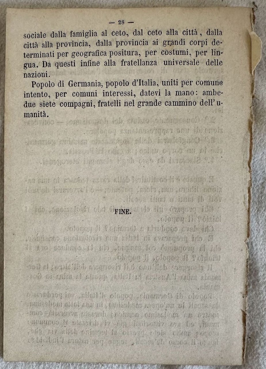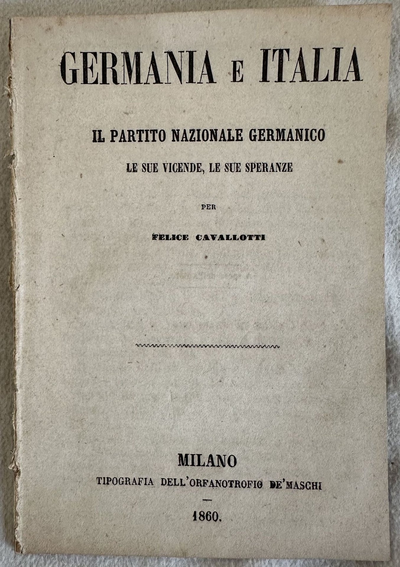 Rara pubblicazione del 1860 sul Partito Nazionale Germanico del poeta e scrittore italiano Felice Cavallotti (1842-1898). In buone condizioni. Copertina assente. Legatura in buone condizioni. Pagine in buone condizioni con rare fioriture. In 16. cm 15x10,5. Pp. 28.Scarce pamphlet of 1860 about Partito Nazionale Germanico by the italian poet and writer Felice Cavallotti (1842-1898). In good conditions. Cover lacks. Binding in good conditions. Pages in good conditions with occasional foxing. In 16. cm 15x10,5. Pp. 28.