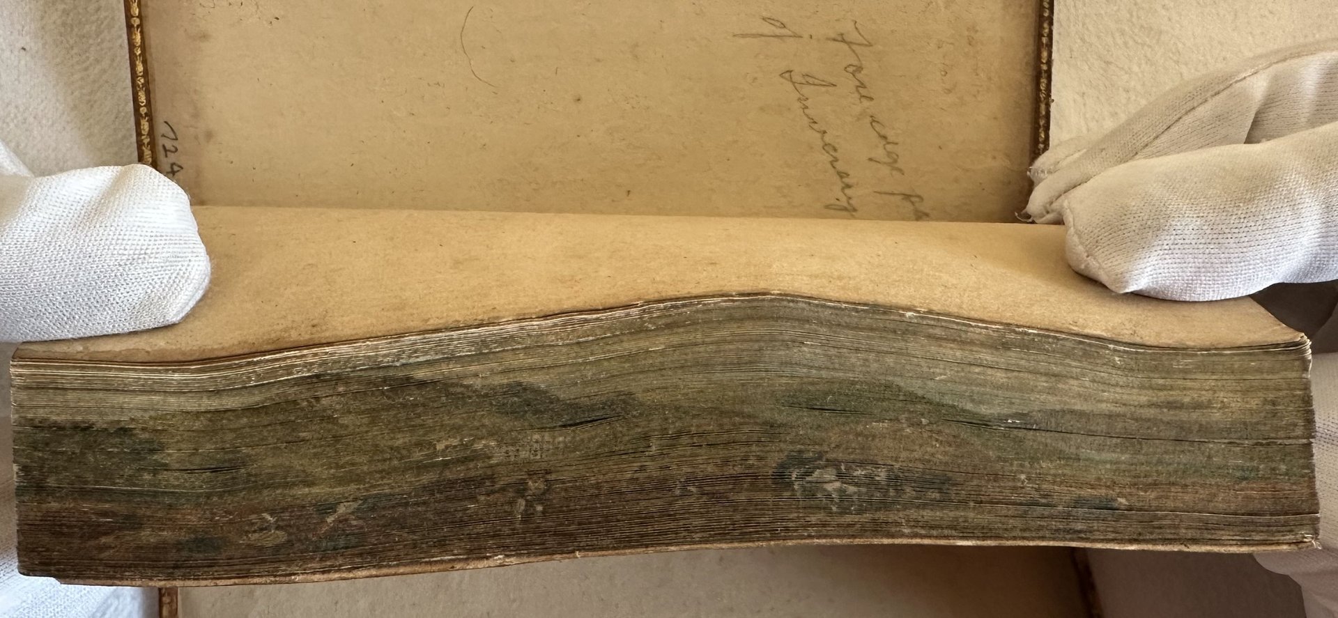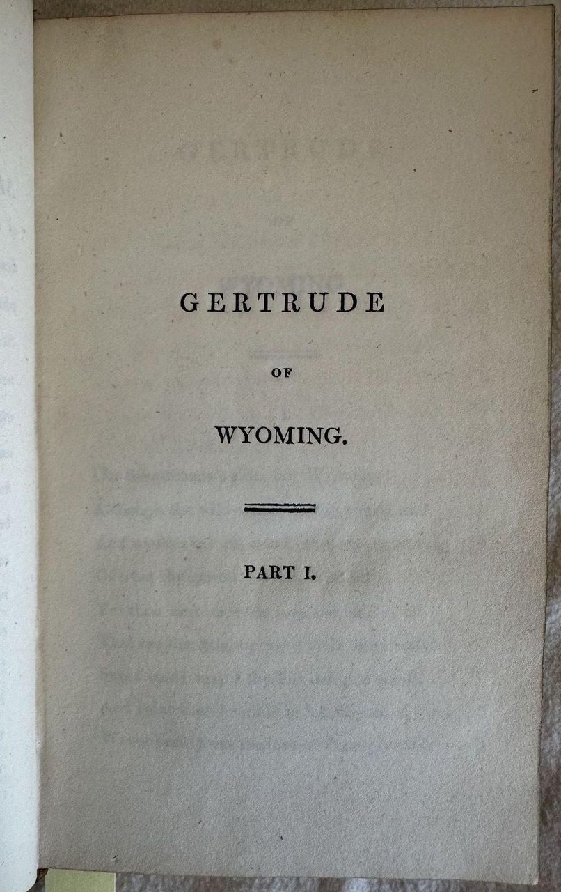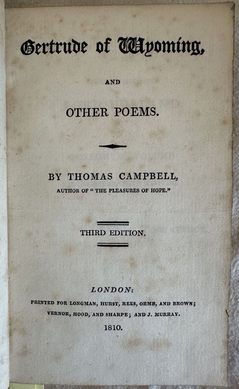 Terza edizione del 1810 di questa opera poetica del poeta scozzese Thomas Campbell (1777-1844). Quest'opera poetica è incentrata sul tristemente celebre massacro del 1778 della Valle del Wyoming (Pennsylvania), un evento che è stato soprannominato "the surpassing horror of the Revolution." John Butler, leader del massacro fu un comandante loialista nella Guerra Rivoluzionaria. Nel 1776 organizzò una banda di predoni bianchi e indiani. Più tardi accompagnò Sir John Johnson nel suo raid agli accampamenti Schoharie e Indiani Mohawk nel1780. Antica firma al verso della prima carta bianca. Ma la verà particolarità di questo esemplare è il "fore-edge painting" o "disegno a scomparsa", un dipinto sul taglio delle pagine che appare solamente tenendo il blocco di pagine tra il pollice e il resto delle dira e piegandolo in modo da allargare leggermente il bordo. Appaiono i dipinti dei personaggi descritti nell'opera. Da chiuso il volume sembra un normalissimo libro dai tagli dorati. Questo rende quest'opera unica. Questa tecnica era molto popolare verso il XVIII secolo per raggiungere il suo culmine fino all'inizio del XX secolo. Il disegno mostra un paesaggio animato con montagne persone e greggi. Antica firma al verso della prima carta bianca. In buone condizioni. Copertina in piena pelle coeva con decorazioni a secco al dorso e piatti in discrete condizioni generali con usure ai margini e dorso. Legatura in buone condizioni. All'interno le pagine si presentano in ottime condizioni con rare fioriture. In 16. Dim. 17x10,5 cm. Pp. (6)+252. Third edition of 1810 of this poetic work by the scottish poet Thomas Campbell (1777-1844). This poetic work deals with the notorious 1778 Wyoming Valley [Pennsylvania] Massacre, an event which has been called "the surpassing horror of the Revolution." John Butler, the leader of the massacre was a loyalist commander in the Revolutionary War. In 1776 he organized a band of motley marauders - white men and Indians. He later accompanied Sir John Johnson in his raid on the Schoharie and Mohawk Indian settlements in 1780. But the real particularity of this work is the "fore-edge painting", a painting that appears only with a folding of fore edges. When closed the book is a common tome. This makes this work a unique book. This technique was very popular duraing 18th century to reach its peak to the beginning of 20th century. The drawing represents an animated view with people, mountgains and cattles. Antique handwritten signature in the verso of the first blank page. In good conditions. Leather coeval cover with embossed decorations in the edges and spine in good general conditions lightly worn in the extremities. Binding in good conditions. Inside pages are in good conditions with occasional foxing. In 16. Dim. 17x10,5 cm. Pp. (6)+252.<BR><BR>