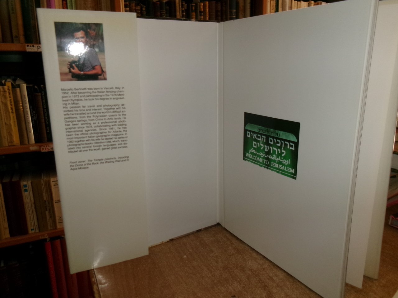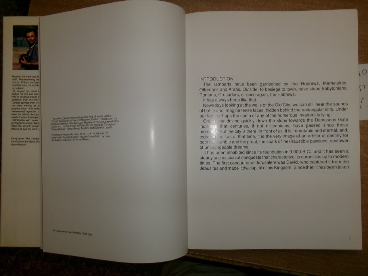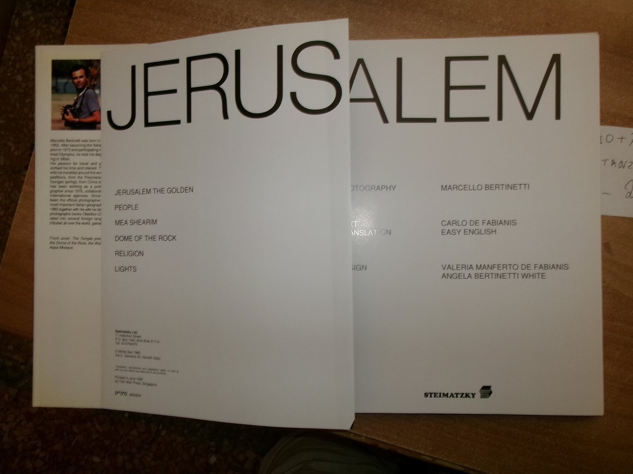 (Gerusalemme) JERUSALEM. Marcello Bertinetti - Carlo De Fabianis. Singapore, by Tien Wah Pess, 1986. In-4°, cartonato edit. ill. a col. con sovracopertina. 114 pp. con numerose immagini fotografiche a colori n.t. e f.t. anche ripiegate. In ottimo stato di conservazione. Non è presente la prima carta bianca- Uff. stanzetta a sinistra III - 2 - 2