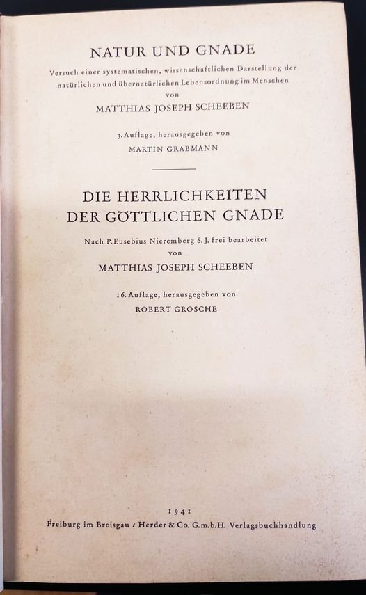 Gesammelte Schriften; Band 1: Natur und Gnade : Versuch einer systematischen Darstellung der natürlichen und übernatürlichen Lebensordnung im Menschen ( 3. Aufl. hrg. von Martin Grabmann) und Die Herrlichkeiten der göttlichen Gnade nach P. Eusebius Nieremberg S.J. frei bearbeitet von Matth. Joseph Scheeben , 16. Aufl. hrg. von Robert Grosche