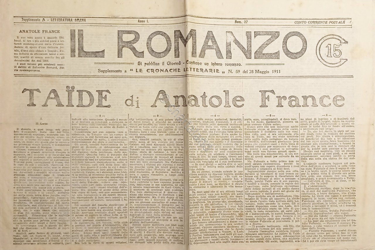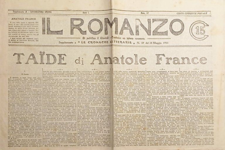 Giornale - Il Romanzo N. 27 - 1911 Taide di Anatole France Testo in lingua italiana. Pagine 12 Condizioni buone come da foto.