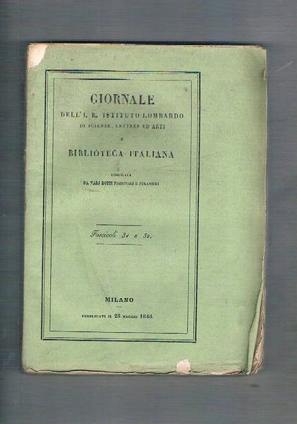 Giornale dell'I. R. Istituto lombardo di scienze, lettere ed arti e biblioteca italiana, composta da vari dotti nazionali e stranieri. Tomo XI° fasc. 31-33 in due vol. Note relative alle comete visibili; degli effetti delle sottrazioni sanguigne sull'umano organismo; ecc.
