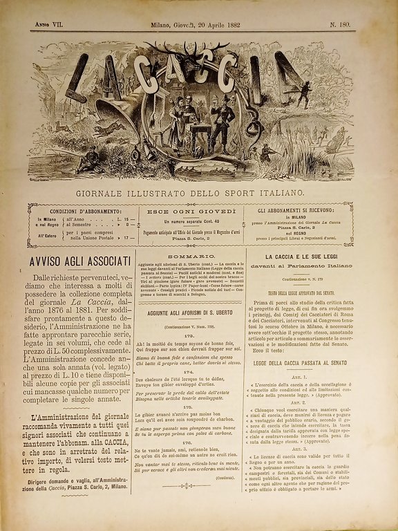 Giornale Illustrato dello Sport Italiano - La Caccia N. 180 - 20 Aprile 1882 Testo in lingua italiana. Pagine 8 con illustrazioni. Condizioni buone come da foto.