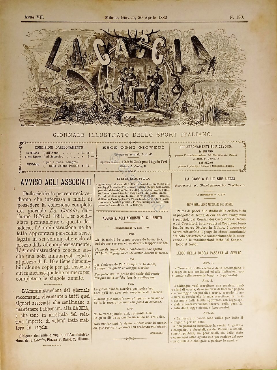 Giornale Illustrato dello Sport Italiano - La Caccia N. 180 - 20 Aprile 1882